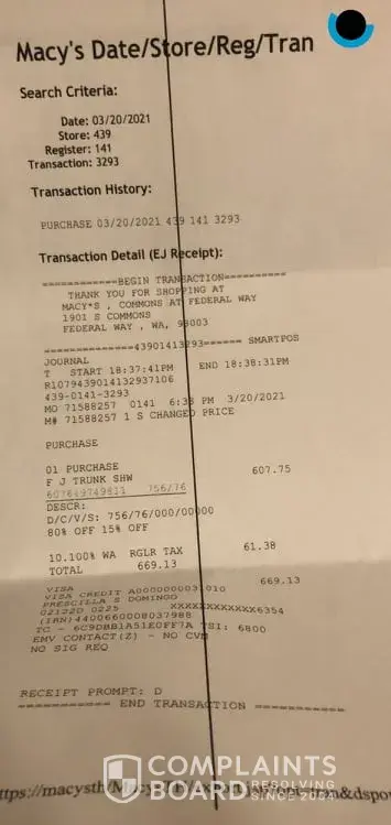 On behalf of my mother, I would like to make a complaint about the amount of $699.13 which Macy's Federal Way charged to my mother's credit card. She shopped on the said date in the mall, but she did not purchase the item and did not get a receipt. As Federal Way branch is already closed down, Macy's Tukiwala has kindly provided her a transaction copy attached here.