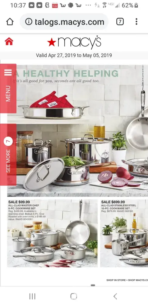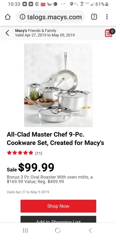 I have an add for a All clad Master Chef 9 piece cookware set that is advertised for 99.00. When I purchased this on line it showed me total as 499.00. I contacted customer service and was told that the price would be 350.00 and that the ad price was wrong. This is false advertisement. I have been a Macys cardholder for years and yet they continue to mislead customers with false ads. This is terrible service and Macys should honor the price on their ad.