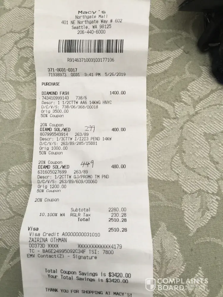 I bought two diamonds pendant at Macys Northgate mall seattle, Wa on 5/26/2019. I was disappointed that the customer service person did not tell me that the Memorial Day price was cheaper then what was at that store. I only knew it when I went home.