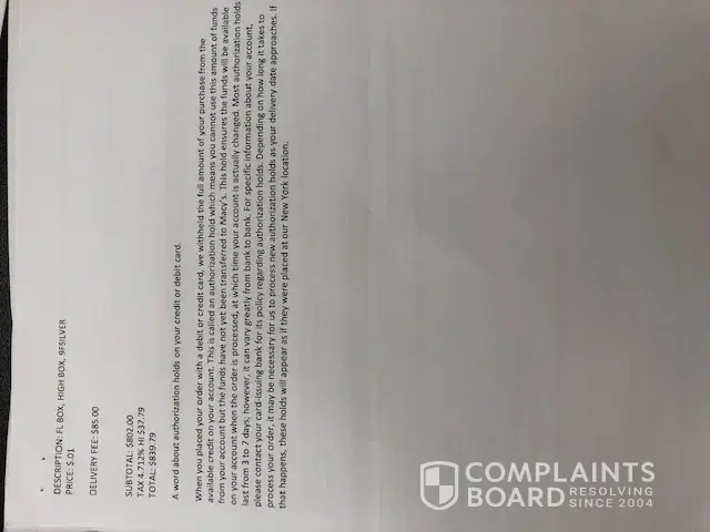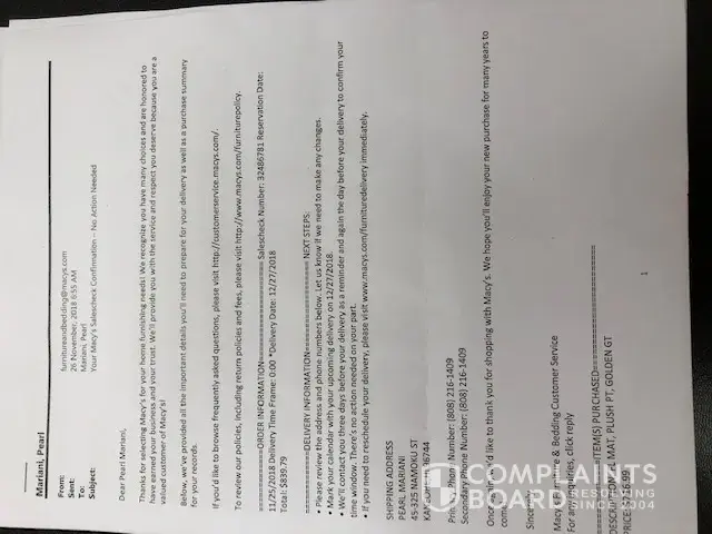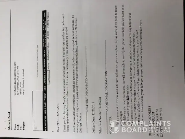 Meanwhile we waited for macy's to send me the return labels for ups by email, I never got them. Ups came to our house next day and we were not home (because we was not notified by macy's) next day ups return and picked up 3 out of the 4 boxes because macy's only send 3 tags. Ups left 1 box at our home. I contacted macy's again and so far nothing has being done!