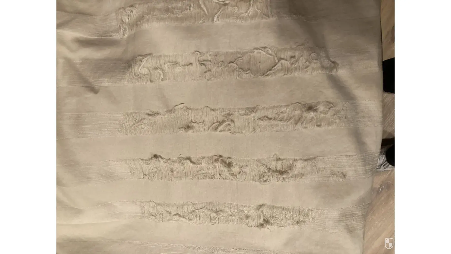 The fitted sheet has two large areas that are shredding.