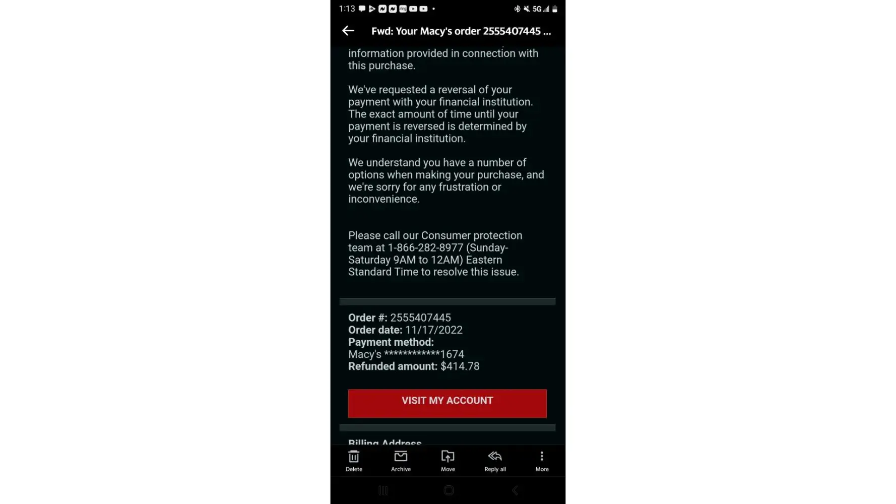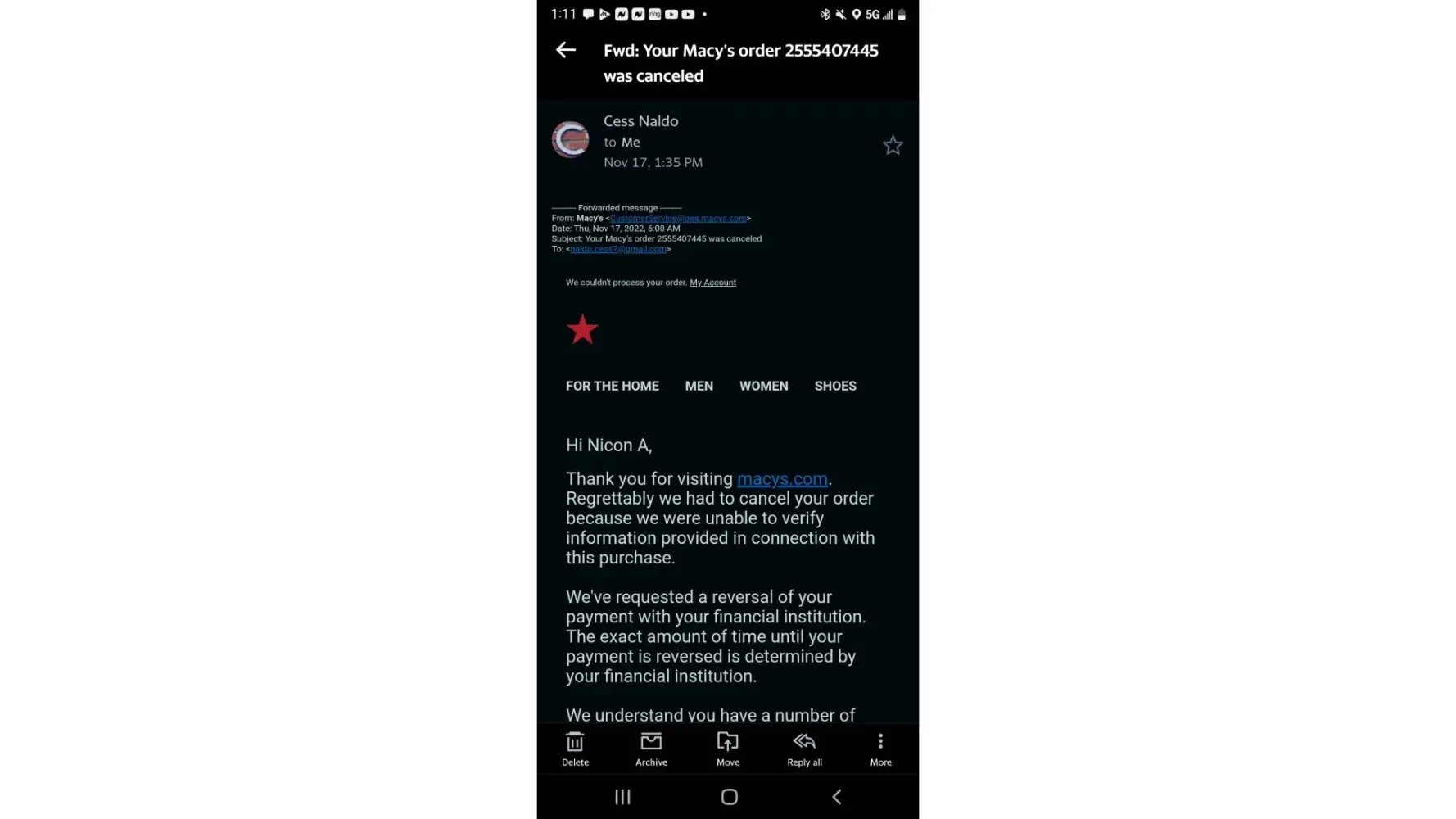 Hello and good morning. My name is Mary Williams and I work for a car dealership in Daphne, Alabama. For the last month, maybe longer I have been receiving calls from Macy's customers that are trying to make a payment on their bill and what have you. Of course, I can't help them because there is absolutely NO affiliation between our store (that sells Nissan vehicles) and a department store. The last few days I have tried reaching out to anyone from Macy's, including the main store in Herald's Square location in New York. I have been hung up on, told to just transfer the Macy's customers to them (the billing department?), etc. I don't believe this is feasible idea because to be perfectly honest, I'm not sure if this is scam or not. Help needs to be given to these people and figure out what exactly is going on, and if this is a scam then it needs to be shut down immediately. Thank you for your help and have a blessed day.