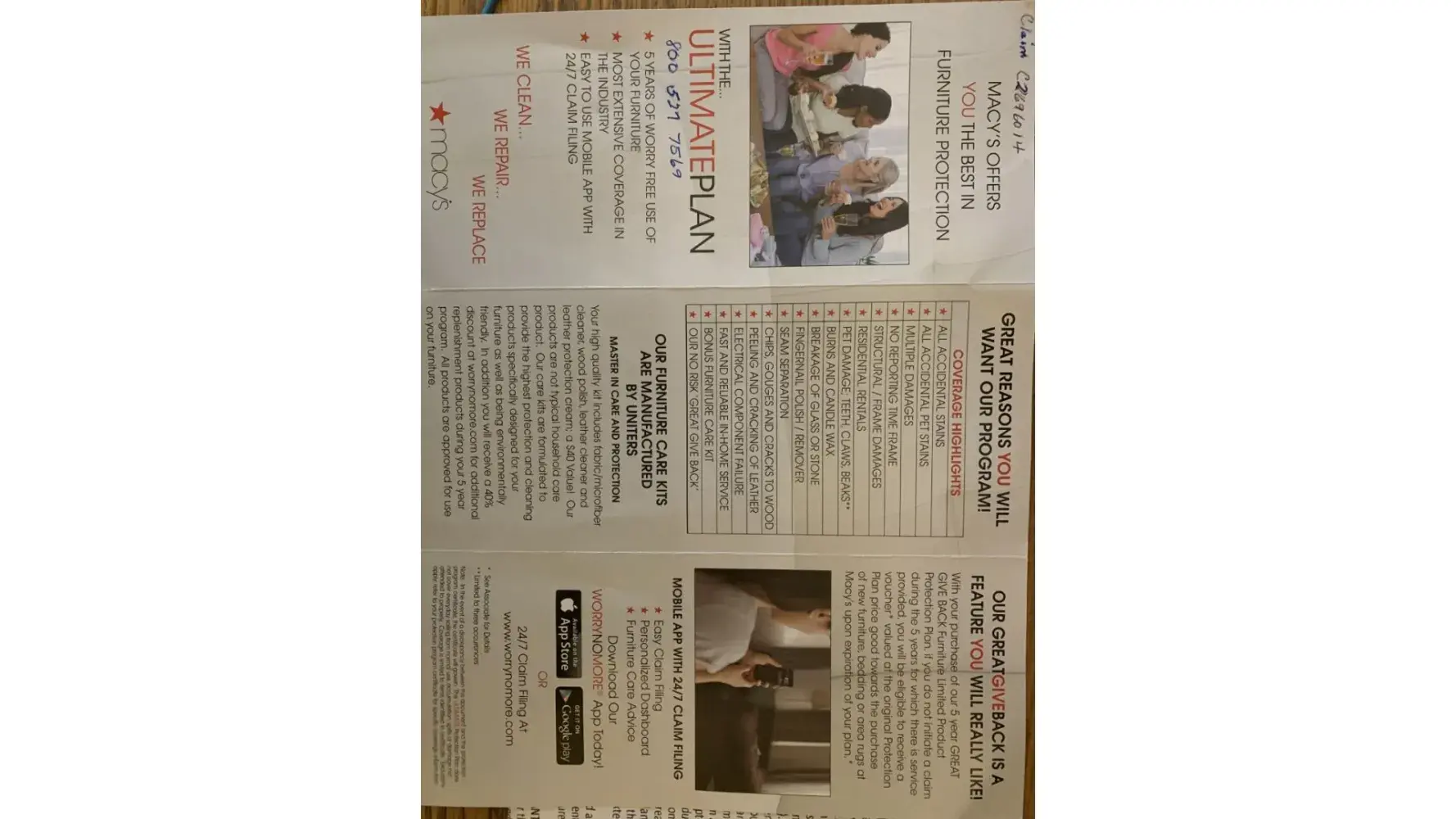 Purchase tqo leather recliner couches in July 2019. Also purchase the 5 year "NO worry no Moore" Ultimate protection plan. Was told that several incidents were covered. Th brocure claearly states that peeling and Pet damage are covered. But when I went to file claims. Both were denied. Of couse the only thing you have to go by is the brochure and the contract is sent to you by PDF in an email. Total scam...