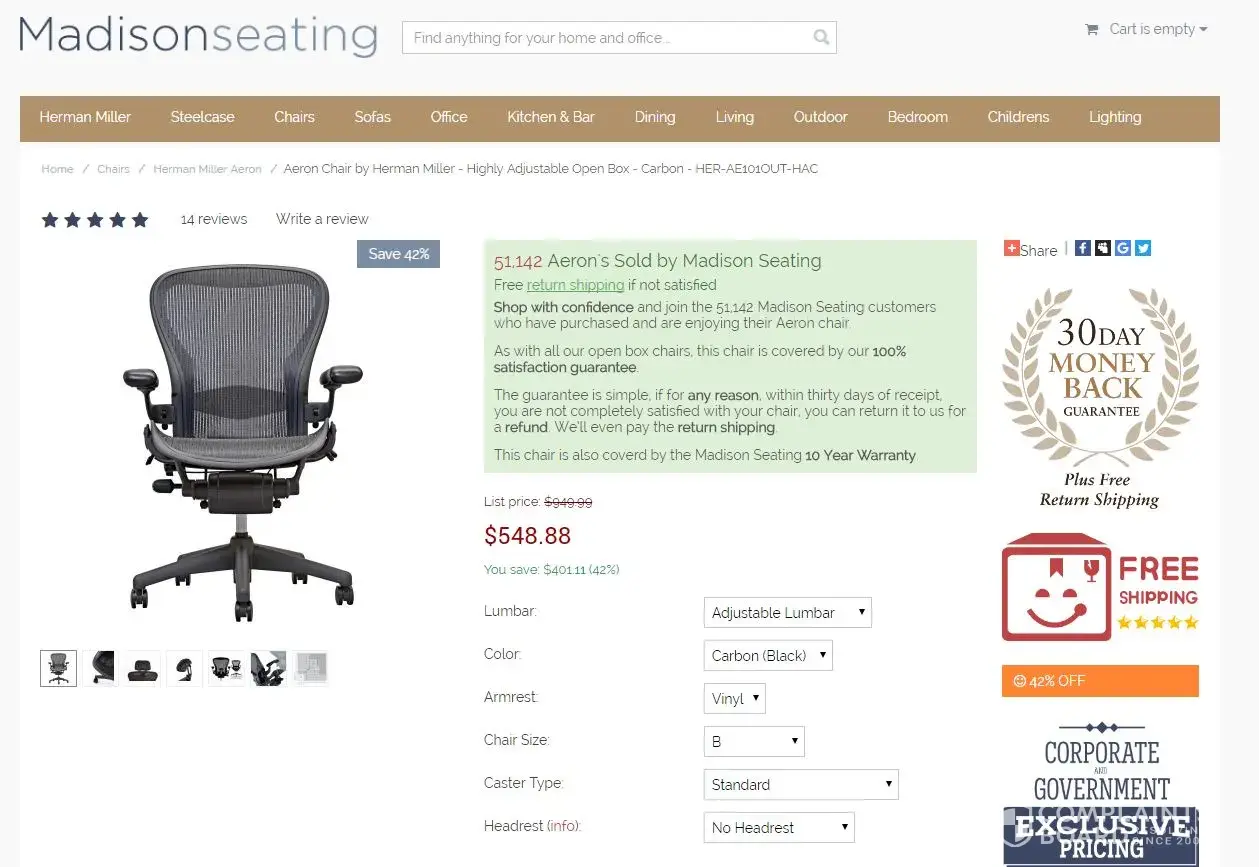 I bought a Herman Miller Aeron chair from Madisonseating.com, and I was excited to get it. The price was really good, but it was supposed to take 10-14 business days to ship. I was okay with that because I was getting a good deal. But after 14 business days, I still hadn't heard anything about my order. I was starting to get worried, so I contacted customer service.