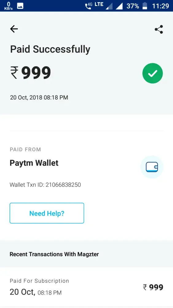 I paid for first time for magzter gold subscription through paytm as per offer of full cashbacks of 999rs.