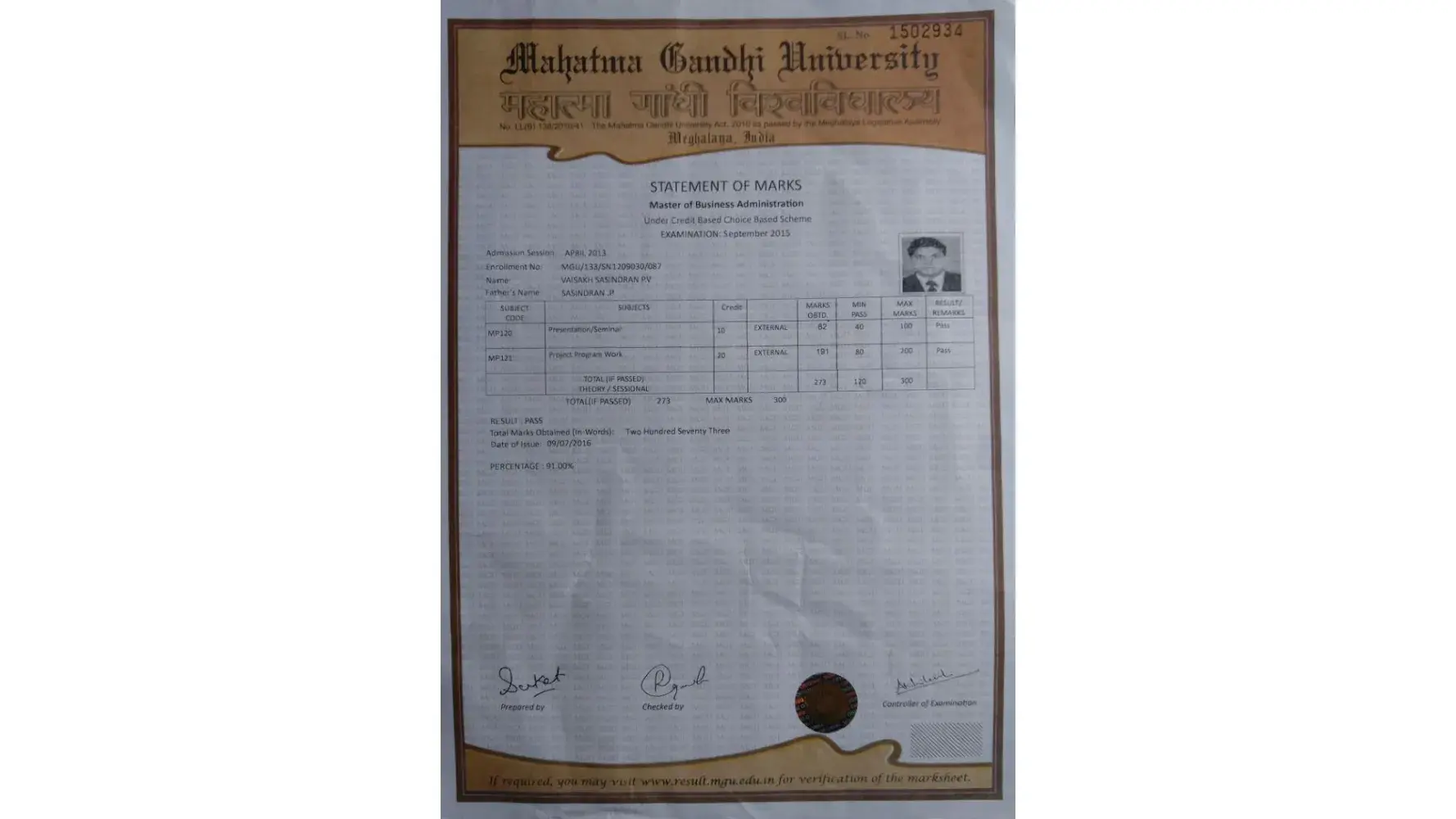 For the certificate, I should have paid 5000 Indian rupees, and I received the certificate in poor quality. Regarding the subject, I report to university knowledge through mail on July 27, 2023. Until now, I have not received any feedback from the university via email (deo.[protected]@mgu.edu.in) or phone.