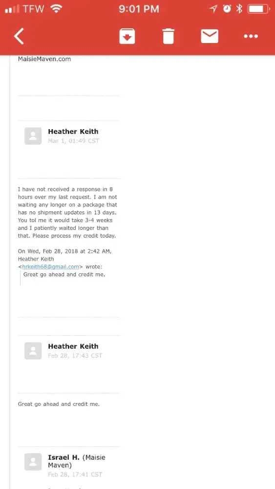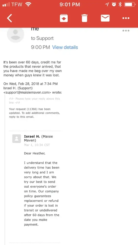 I bought 3 items from Maisie maven on September 7, 2017. It did not appear as I saw it online it looks cheaper to me; so I ask them for a return address to return their items which it did get to them within a timely manner by USPS because I paid for Express to get there within 3 days $67.40 they stayed with my money and the items I return so they did me dirty, Low Down Scammers! They owe me $103.85. I am disputing with my bank for the amount they owes me which should have been simpler if they would just refund me because they already got their product. I WISH THEY WILL GO OUT OF BUSINESS!