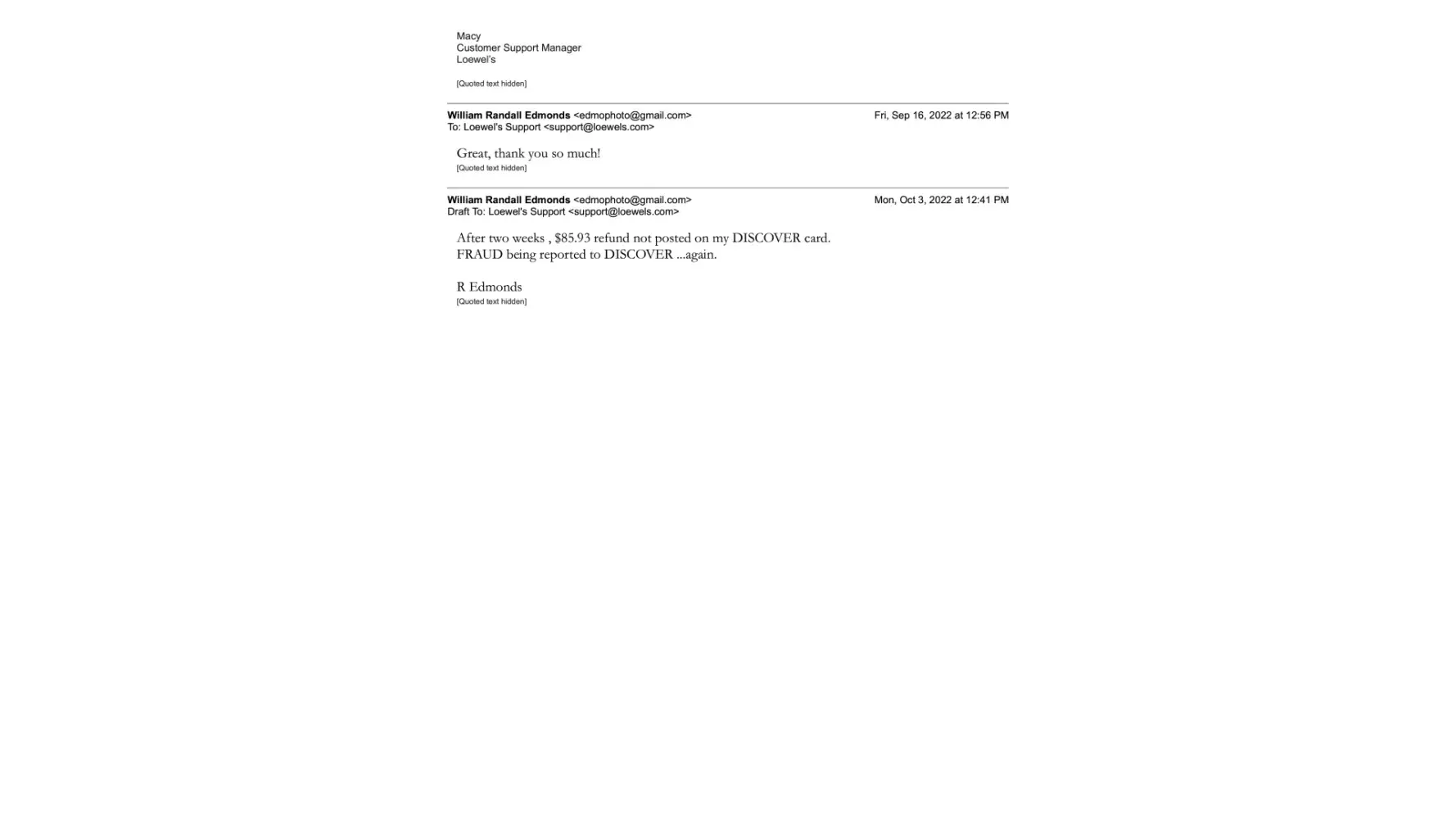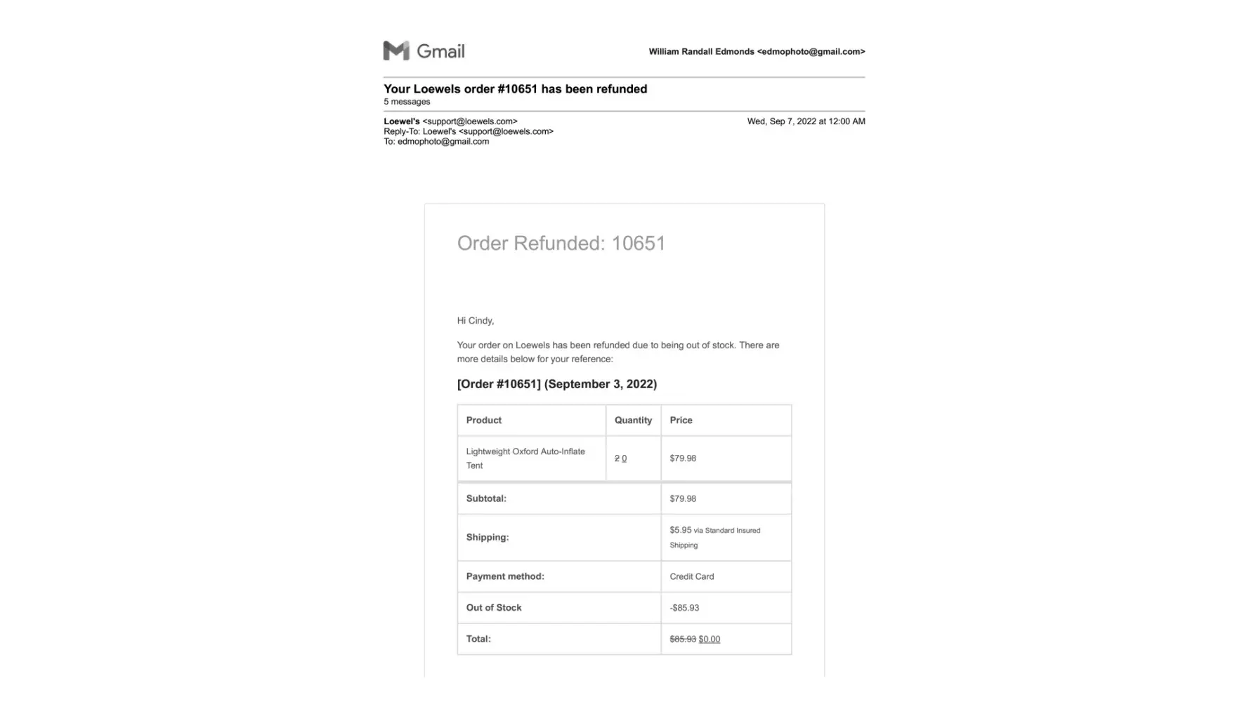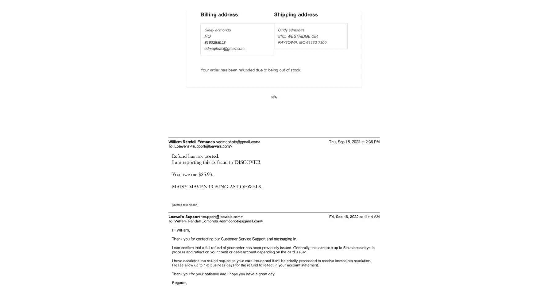 DISCOVER looking into on my $85 purchase of a tent, company posing as a "Loewel's" (sic) on September 03 2022.