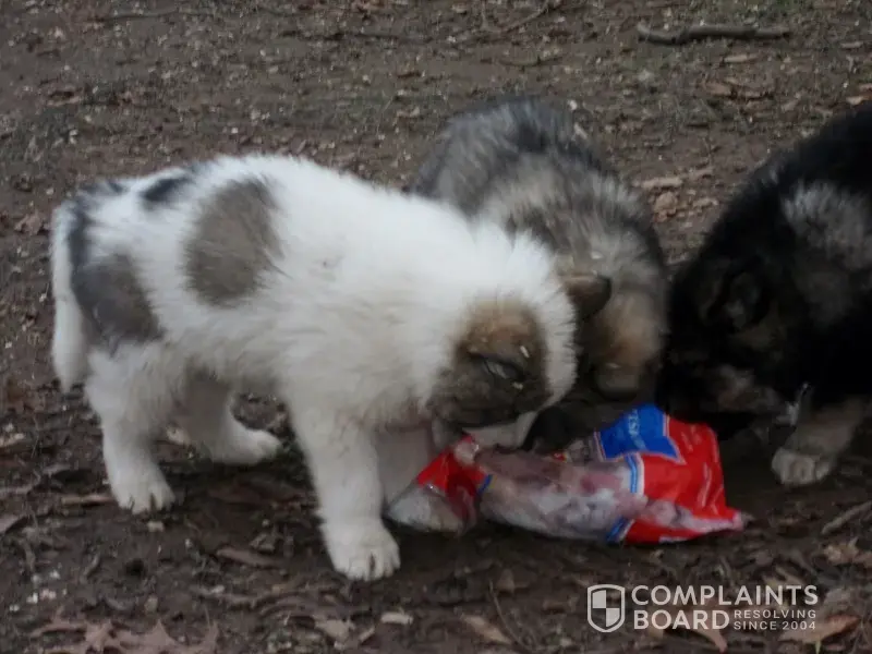 I agree 100% with all of the above. I am one client who purchased a "healthy" puppy but after our first wellness check, our puppy has a heart defect. We have kept the breeder in the loop since day one and after a final diagnosis and screening by a specialist, the breeder tells me I'm not using my brain since we have decided to keep our puppy verses destroy him (as she suggested last month). We have seen her kennel in person, the amount of dogs on her land is mind boggling. She has her dogs birthing litters every month, by the masses. How do you feel about your new puppy (you already put a deposit on) trying to feed on raw meat through a thick plastic bag? Eat plastic before meat. Is that how you wheen a puppy off the mothers milk and introduce meat? You be the judge. Pictures attached. Our puppy is among those feeding.