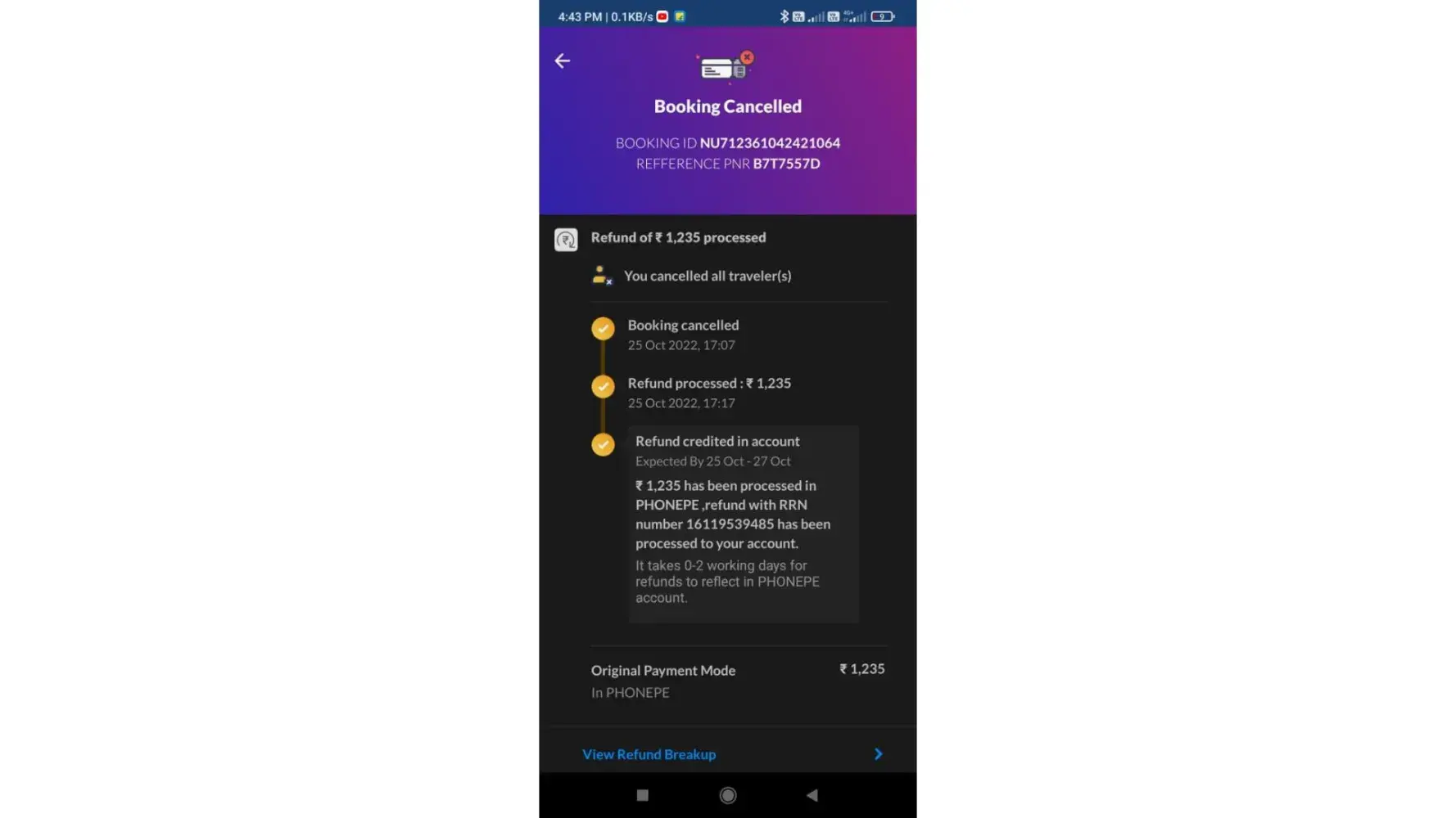 i have received full refund on the other ticket, booked for the same person Sandhiya Marudachalam in the return journey from Mumbai to Chennai ( PNR No. is OTH4YNT) , and the same was promptly cancelled and refunded.