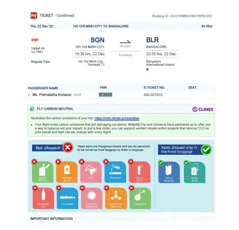 I had booked a ticket from Ho Chin Minh- Bangalore on 28 September 2022.