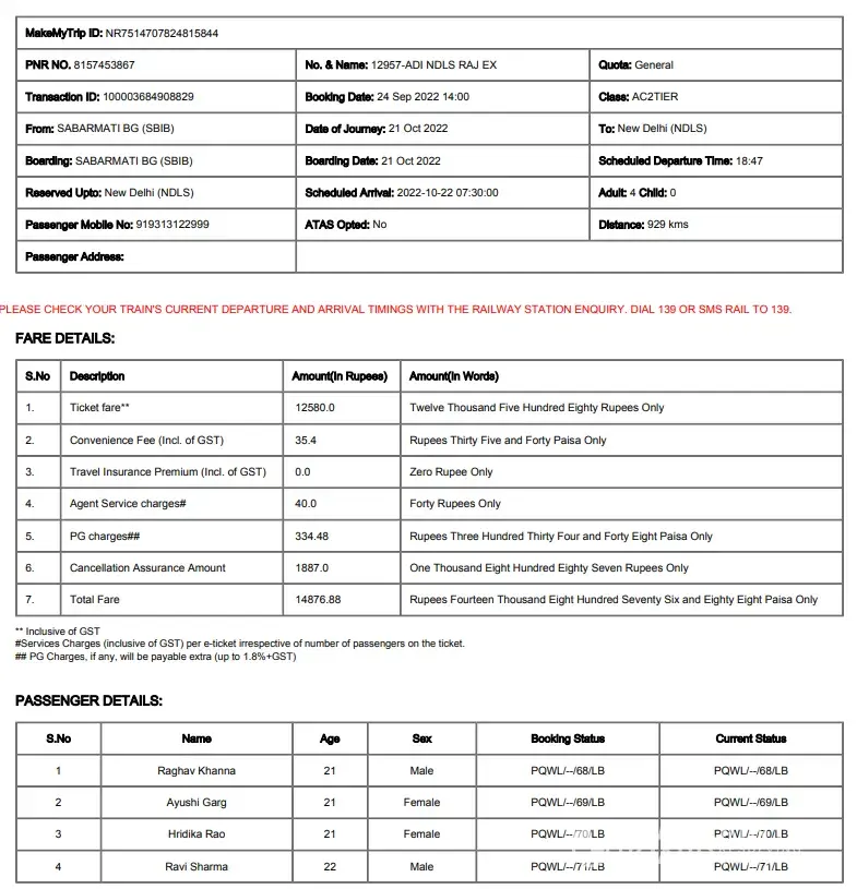 I booked three train tickets on 24th September 2022 from Ahmedabad to New Delhi for 21st October 2022. Refer to the following details of the ticket below.