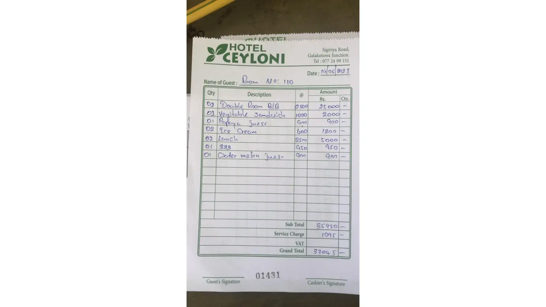 Secondly, since I had prepaid the cost of the accommodation at Dambulla (Sigiriya) from 17 May to 19 May 2023, as part of the overall package, the additional amount paid by me at 3 star Hotel Ceyloni at Dambulla (Sigiriya ) of Sri Lanka Rupees 25,000/- plus taxes, needs to be reimbursed to me. Hotel invoice is attached for reference.