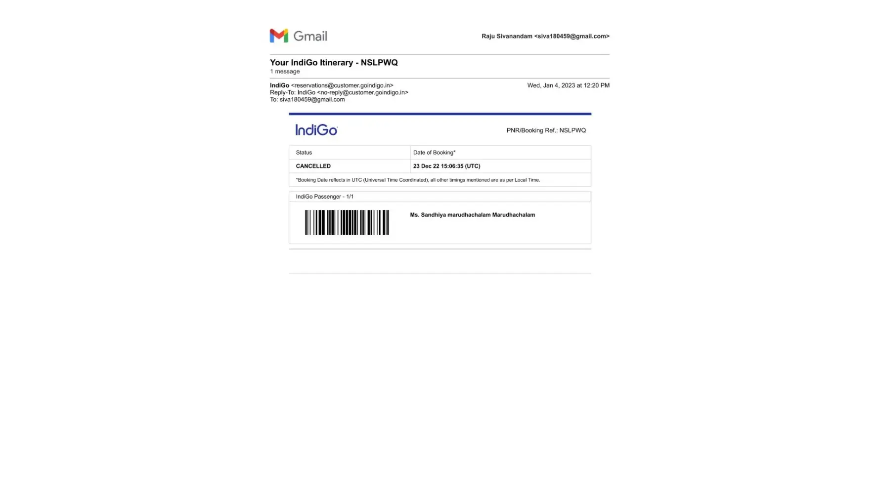 The PNR No. is GJ3Q7L. AND the cancelled passenger name is Sandhiya Marudhachalam, whose is a Senior Citizen.