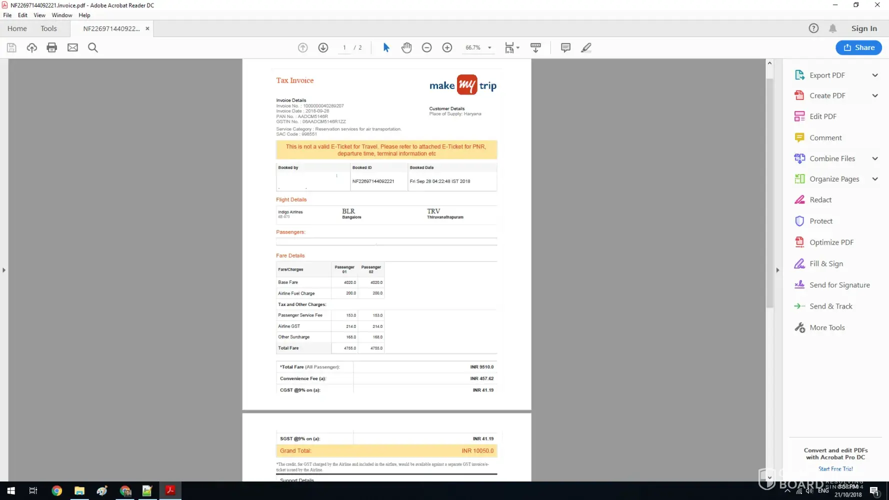 I booked a flight on MakeMyTrip (NF22697144092221) for an Indigo flight from BANGALORE to TRIVANDRUM and was charged Rs 10, 050 in total for two tickets, on 27 Sep 2018 (Invoice No. [protected]). The Airfare charges were Rs 8, 540.00 in total. The same flight now shows the total as 5600 in total and the airfare charges as 3844 for two tickets. I am unable to ring (all they do is send an email link back which is not helpful), email or post online (website asks for a captcha but the captcha service is offline!) to MarkMyTrip through any mechanism for a complaint.