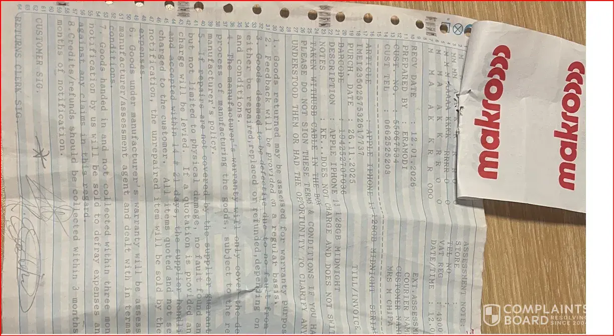 I bought my son a new Iphone 13 at Makro Centurion on the 26/11/2025, only after 4 weeks it was over heating and it didn't charge, I returned it , and was told to remove find my phone app on the phone from another devise, but the report back was the app wasn't activated, and the company that sells the phones to Makro insisted that it was activated, I wa...