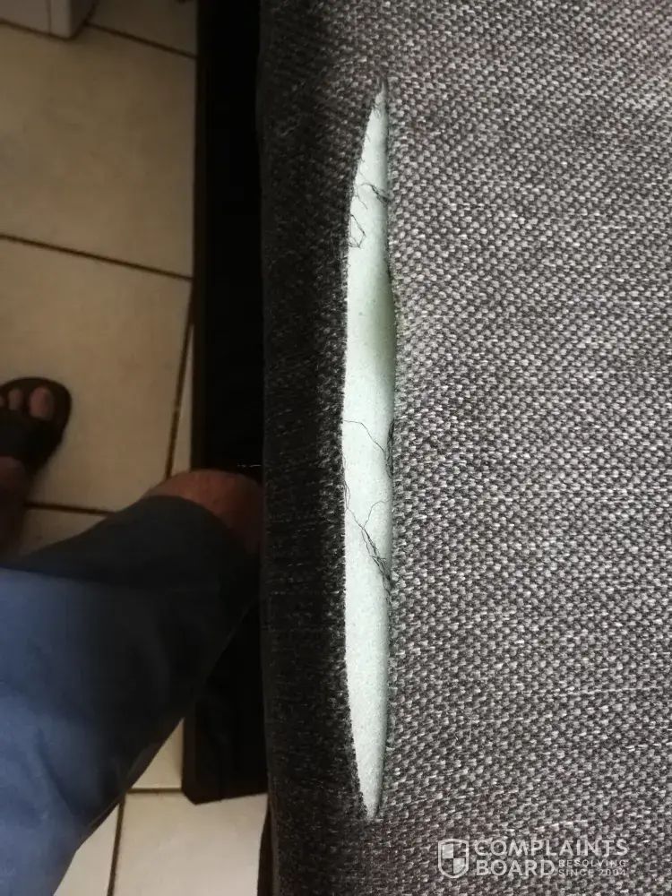 I would like a refund or repair to my couch that I ordered on the 8th of February which only arrived today on the 18th of March and the side is torn.