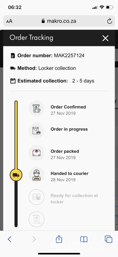 Hi AYESHA, Your order MAK2257124 is en route to Makro Makro Sasol NMR locker. You'll receive locker PIN via SMS when it is ready to collect. Track your order online. [protected]...
