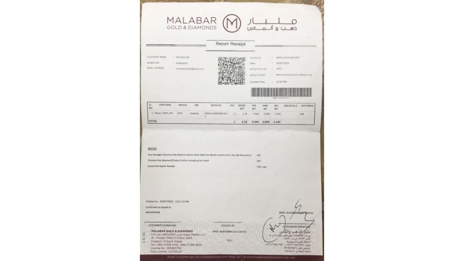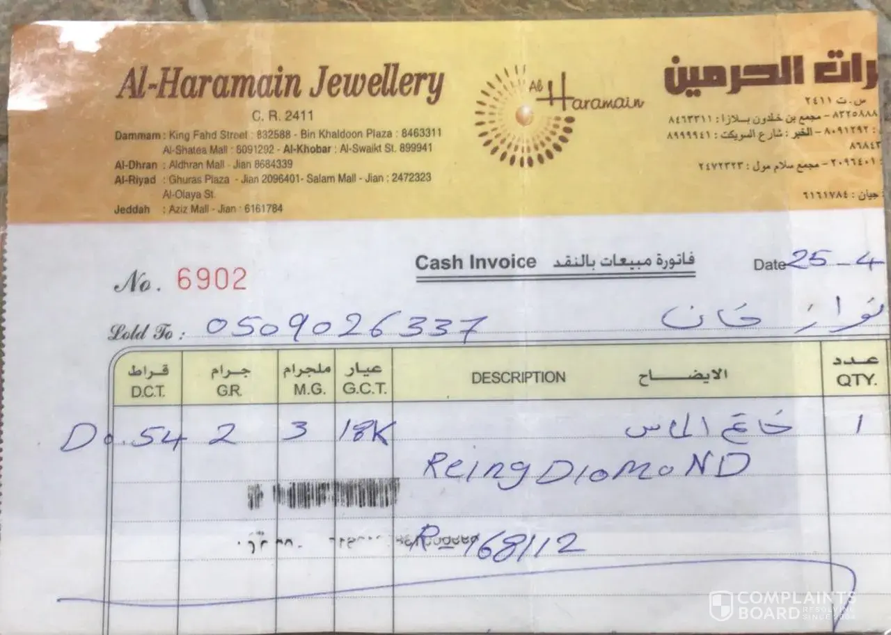 ON 5th June, 2023, I bought Gold necklace worth SR 19050 from Khobar branch KSA. At the same time, I gave 2 rings- an uncut diamond for refixing the stone, and a cut diamond for soldering. Unfortunately, instead of the cut diamond ring, I got another diamond ring of smaller size and of lighter weight. The uncut diamond was alright. We've been going back and forth to query about the ring for almost 5 months. Please take necessary actions ASAP.