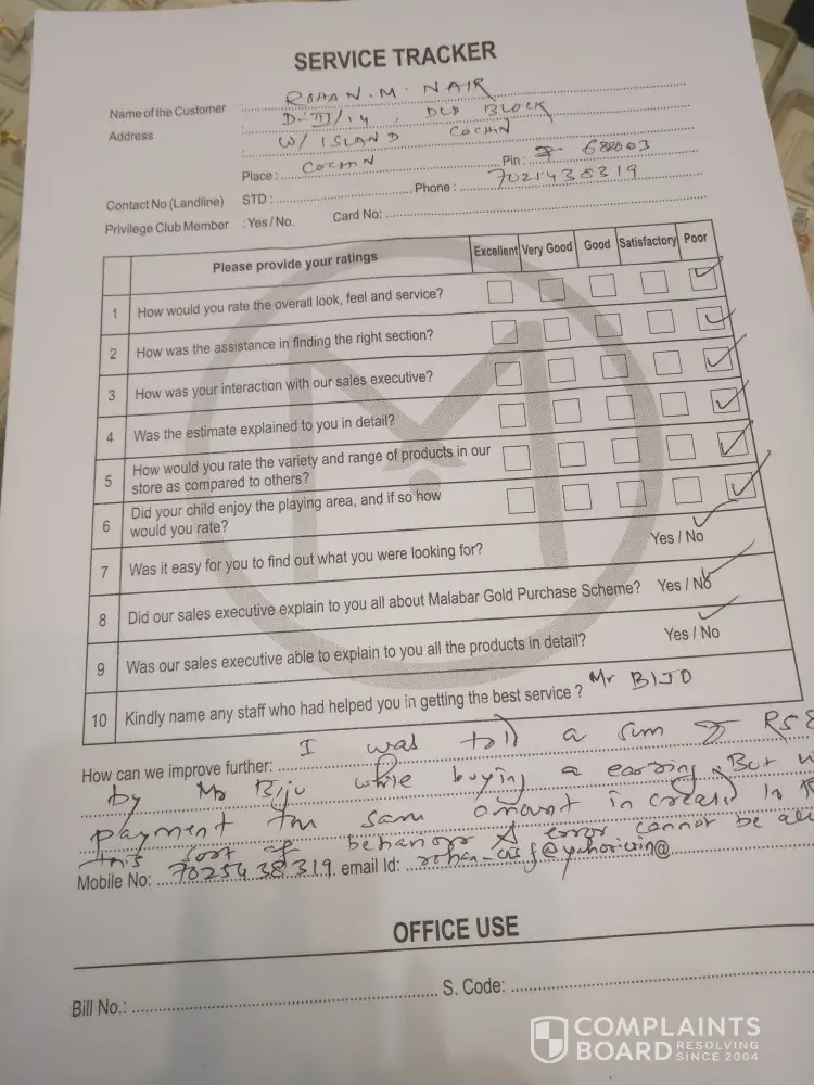 I went to Malabar Gold, in Lulu Mall along with my wife (who is physically challenged as of now due to an accident) and my daughter on 10.0318 evening. We were kept waiting in the counter for quite some time in attended though there was no rush in the Store. When a salesman came without wasting time I selected a earring to be presented to someone and I asked the price of the same. The salesman informed me it would cost around Rs 8700, so I agreed and without wasting time went for payment. At the time of payment instead of giving discounts like normal jewelry the same Salesman Mr Jijo informed me that the amount to be paid is 9700 Ie 1000 Rs more than what I was told. I informed the matter to supervisory staff and store manager present there, I have even written the same in my feed back. This sort of casual attitude towards customers is going to cause the reputation of your firm. The whole staff was very careless and less empathetic even towards a lady walking with crutches, it is requested to take needful action on erring staff especially Mr Jijo for making fun of our sentiments please. Thanking you in anticipation yours sincerely Rohan M Nair, mob [protected]. I request you to kindly go through the CCTV footage. They were apologetic only when I asked for complaint register, I doubt they will throw away my feedback as well. If this is the attitude of staff I have lost faith in Malabar, they are sort of cheating for such a small thing then how can we trust your form and go for purchasing in large quantity when your credibility is doubtful.