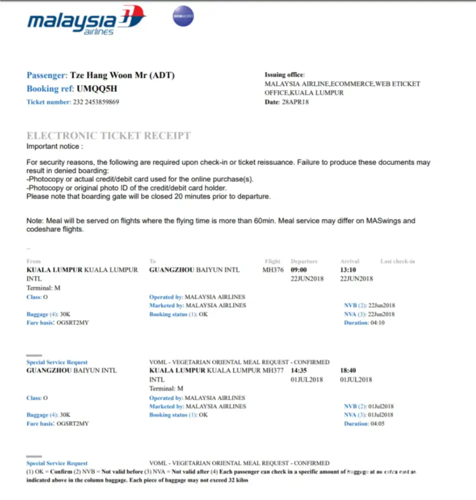 At (28/04/2018) I was purchased the flight ticket from Kuala Lumpur (KUL) to Guangzhou (CAN) on date (22/06/2018) for working and traveling purpose, and with a return ticket from Guangzhou (CAN) back to Kuala Lumpur (KUL) on date (01/07/2018).