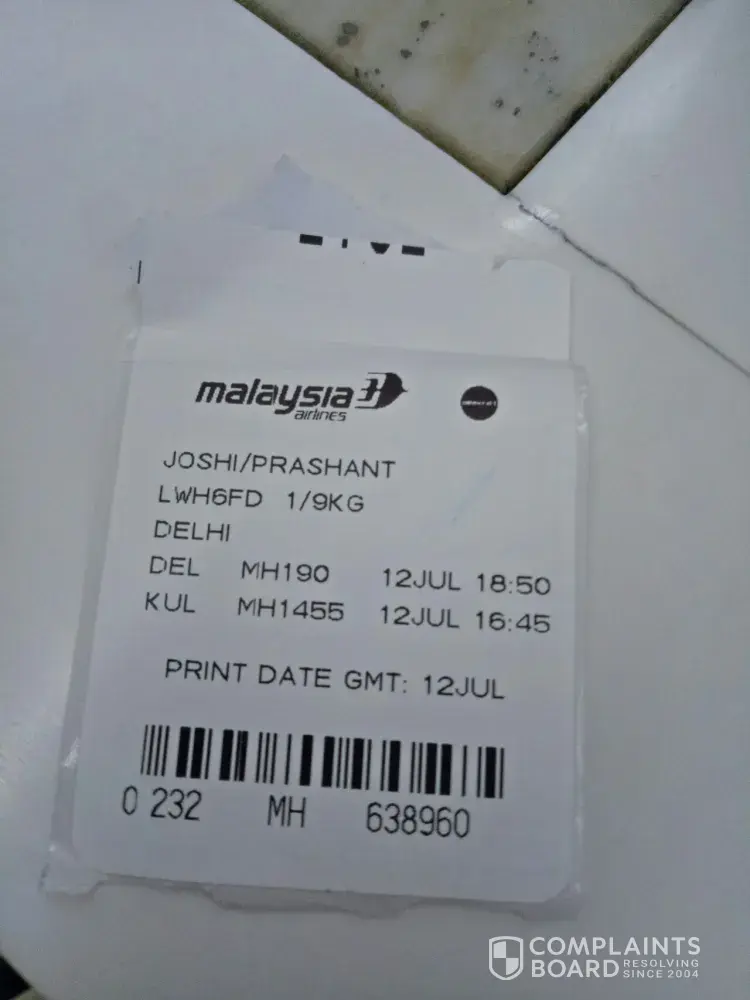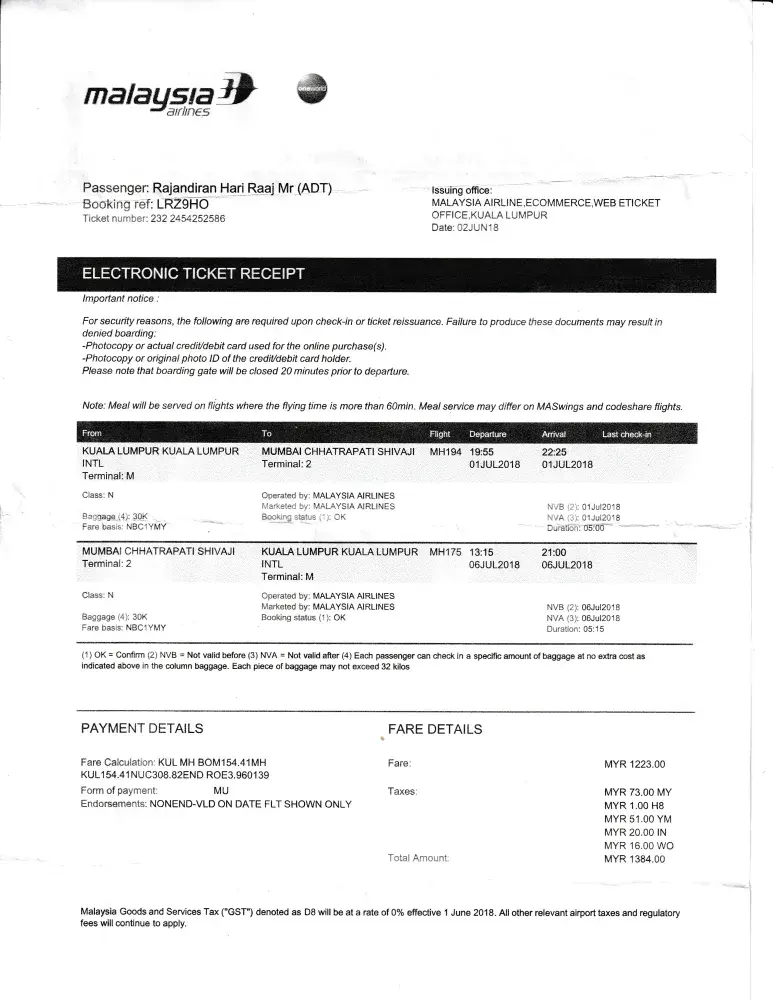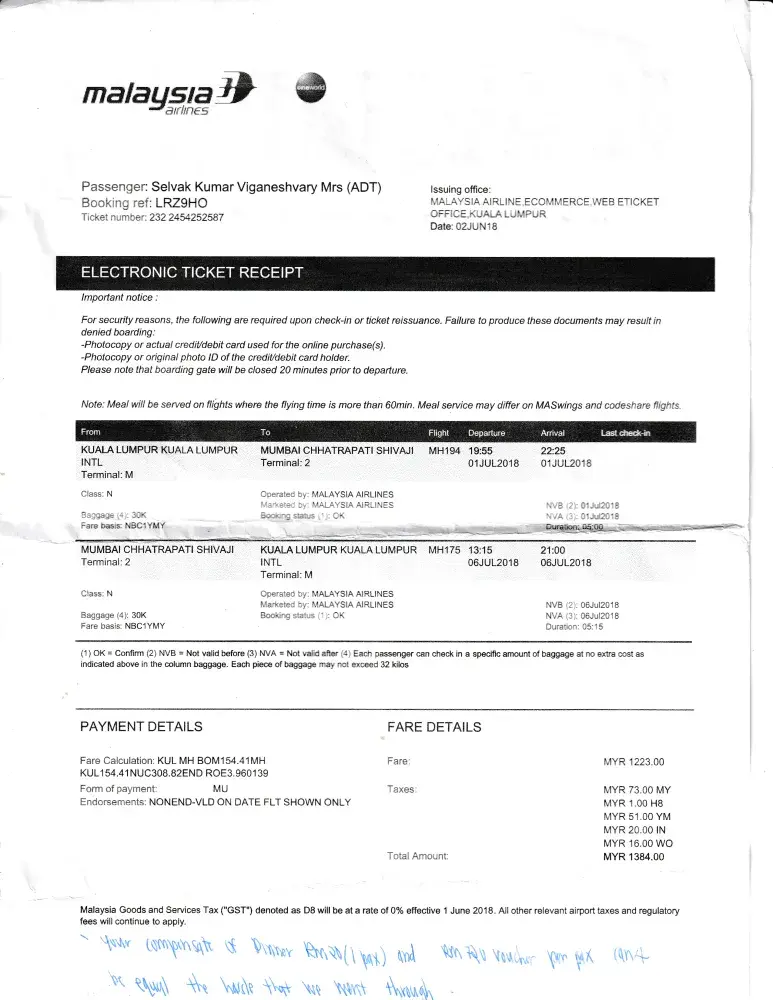 On 1st july 2018 I was scheduled to fly on malaysia airlines flight number [mh194] from kuala lumpur to mumbai chhatrapati shivaji.