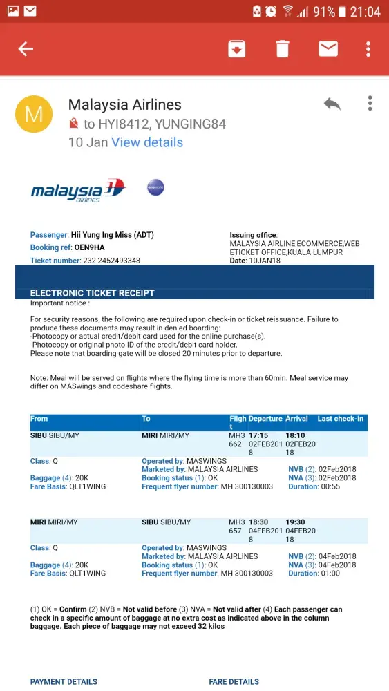 Frequent flyer number: MH [protected]