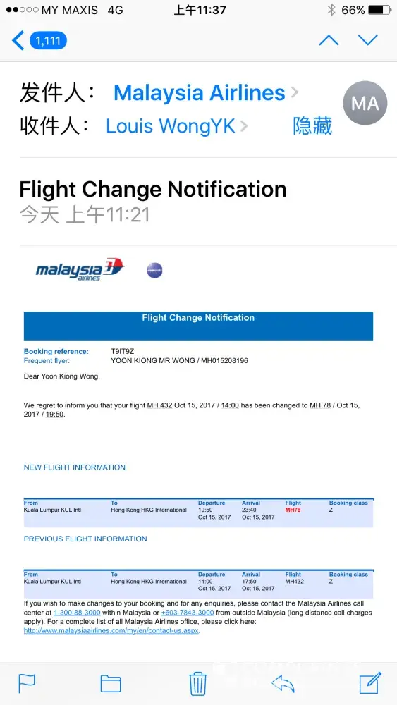 mh432 last minute reschedule to mh078 on 15 oct 2017