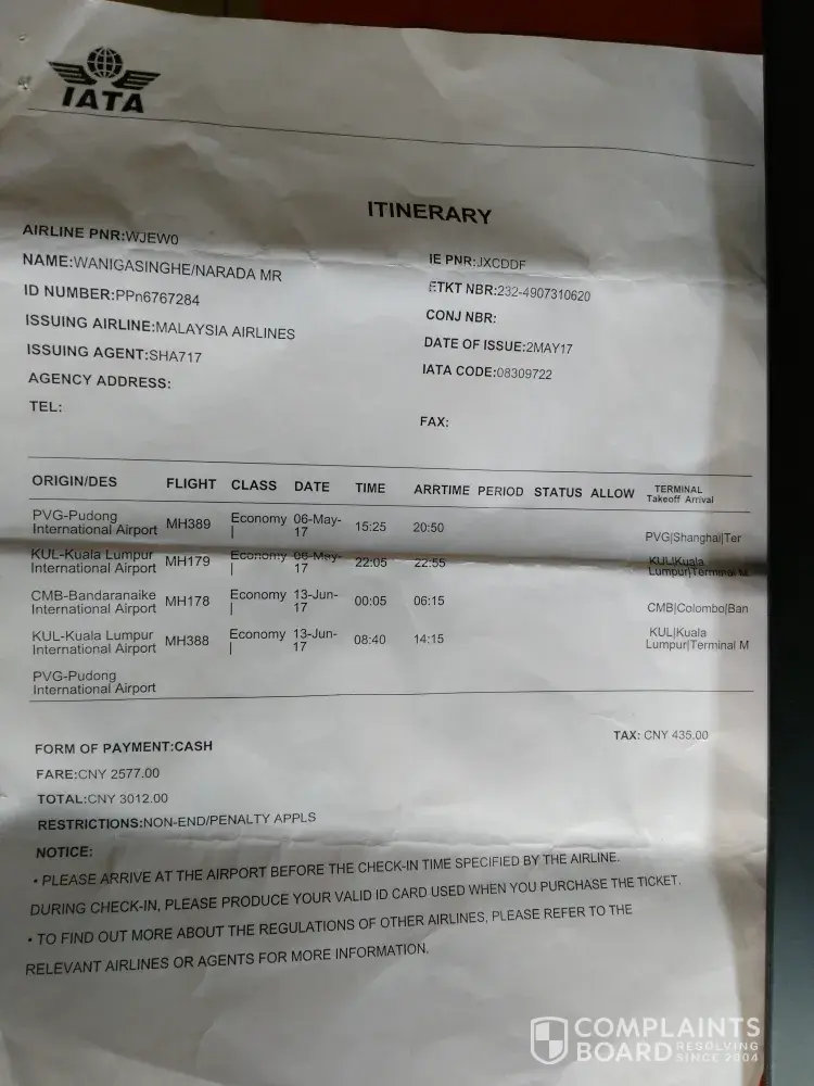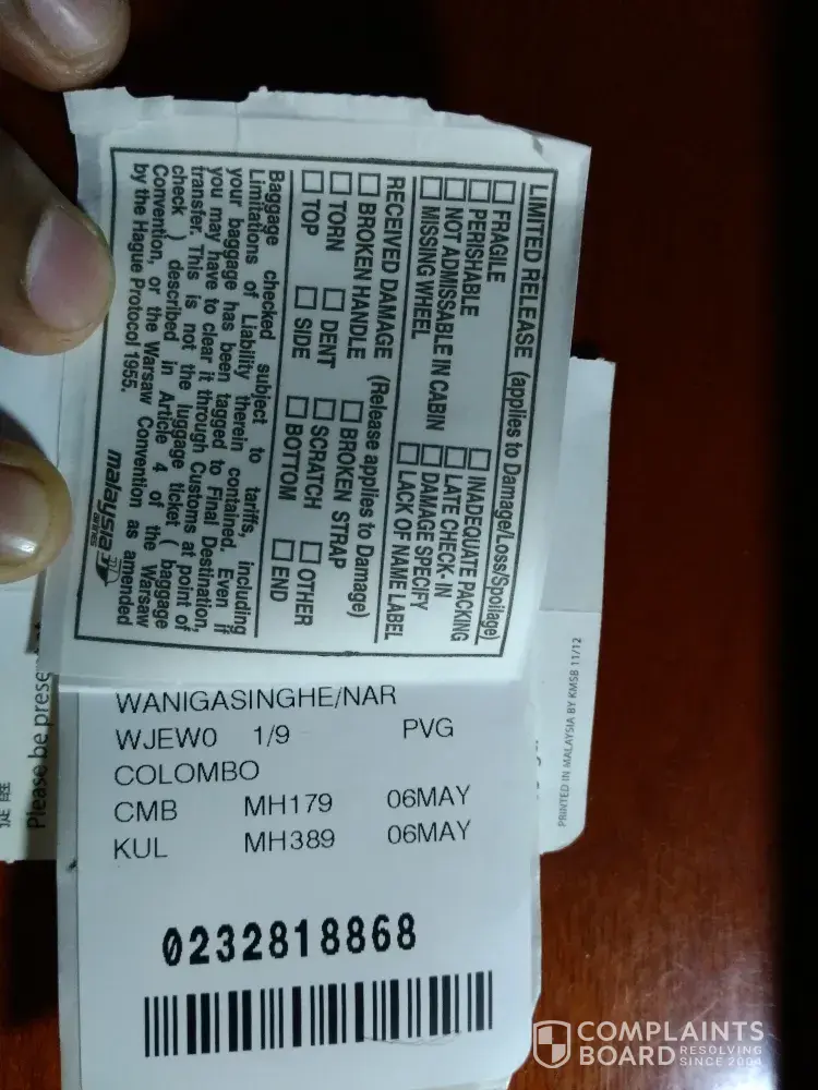 I, narada wanigasinghe is an engineer in sri lanka army and presently following a course in china - chongqing. I had to have urgent travelling to china to sri lanka due to sickness and then hospitalized of my beloved wife. So booked the flight schedule through the ctrip on 02/05/2017 planning to depature on 06/05/2017. Mh389 malaysia airline flight was delayed for more than 50 min to depart from pvg (15:25 +50 min), then there was scheduled to have a transit at kul for 75min but mh179 malaysia airline was not delayed so I rushed to that flight with a rep of malaysia airline but once I searched my two baggages only got to know that those were not sent with me. Then I made a property irregularity report at sri lankan air under cmbmh17891/06may17/1824gmt. Then I lodge in a hotel and by 1200hrs it was received. They infored me that it will be delivered to my home.