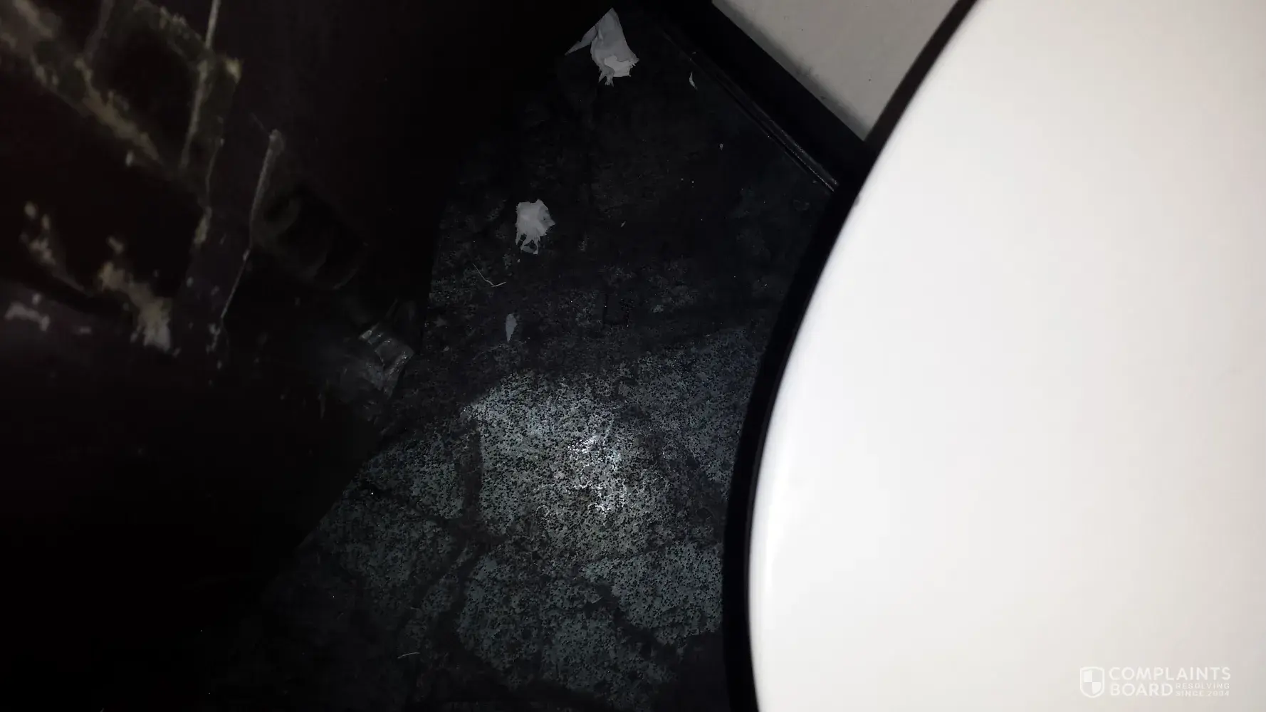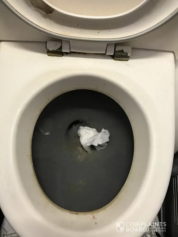 What was particularly unpleasant was the state of the toilets. I attach photos of the disgraceful state of the toilet bowl itself, the inside of the lid which had such a rough surface it could not possibly be cleaned properly, the floor which was equally disgusting, and the dirt around the toilet lid hinge. Unfortunately I have lost the photo of the built in unit below the basin, which was literally held together with sticky tape.