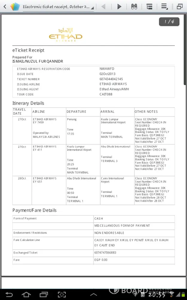 Flight details penang to cairo ticket number is [protected], from penang to kl, ey 7459, at 1535, kl to abu dhabi, ey 411, at 2025 and abu dhabi to cairo, ey 651, at 0050, dated 27th oct 2013.