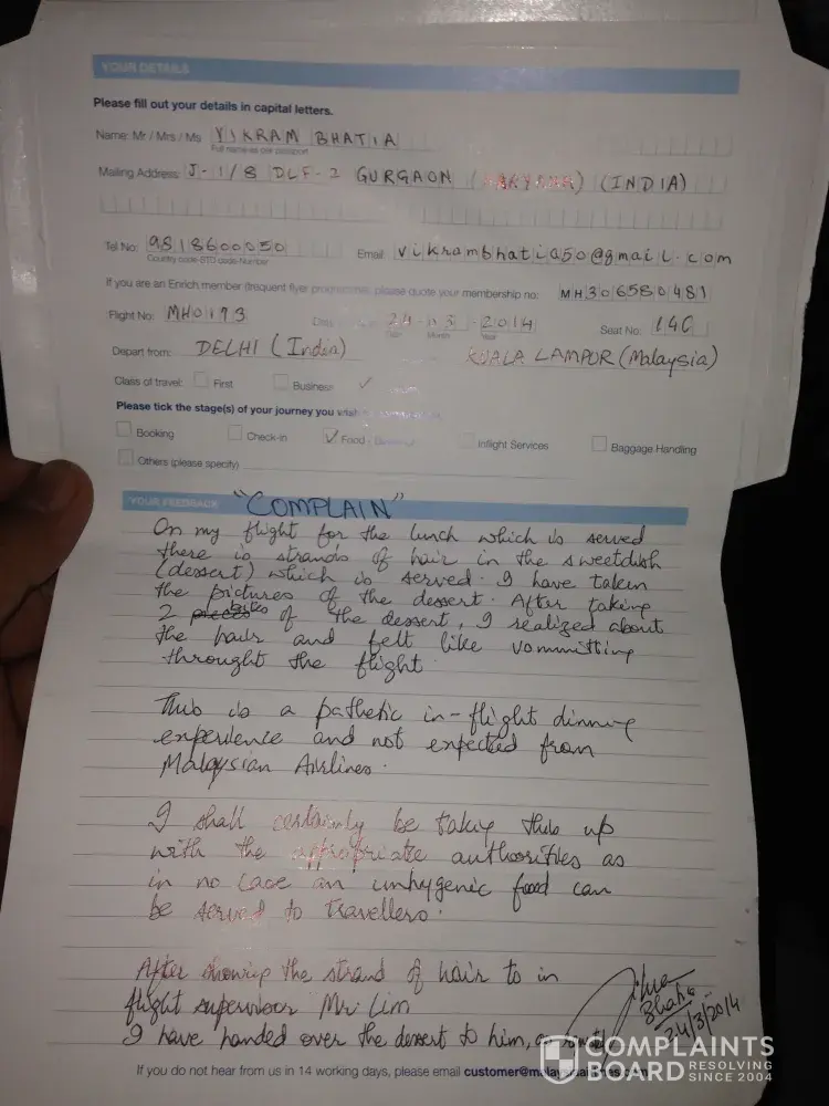 On my Malaysia airline flight from Delhi to Kuala lumpur (flight number MH0173) travelled on 24/3/2014 the dessert which was served in lunch had strands of hair, needless to say it was unhygenic and i started feeling dizzy after eating the same. I reported the same to in flight supervisor Mr. Lim and documented the same on the complaint form but till date there is not even an apology on the rotten food i was made to eat... i have the pictures of the dessert with the strands and the complain form. I plan to go legal now and sue the airlines...any better suggestions?