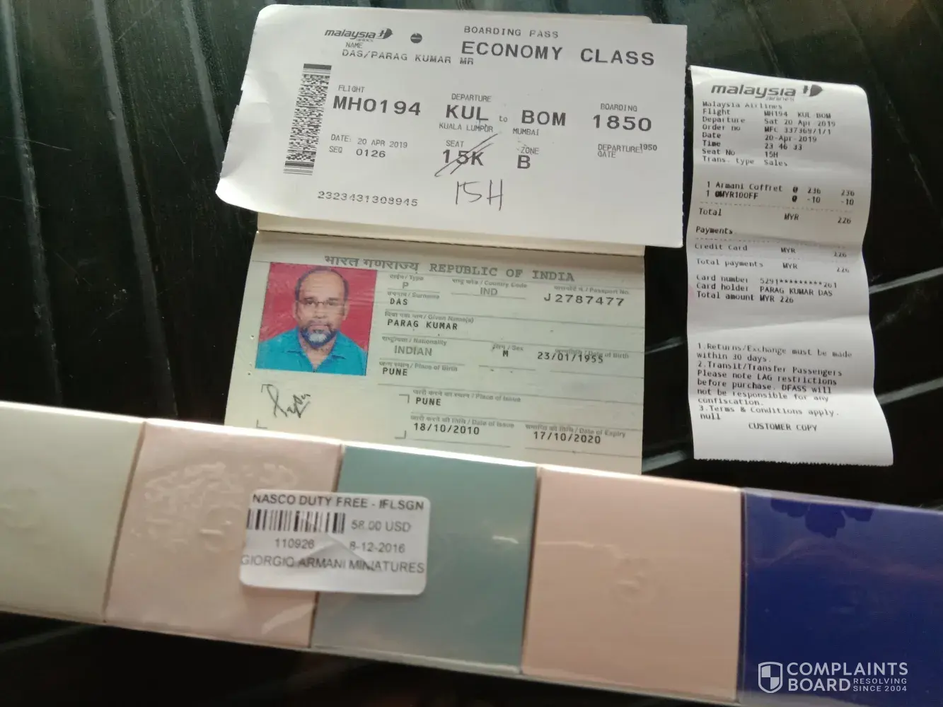 I was travelling from KL to Mumbai on 20th April by Malaysia Air lines MHO 194 . I purchased a GORGIO ARMANI set of perfume for 226MYR