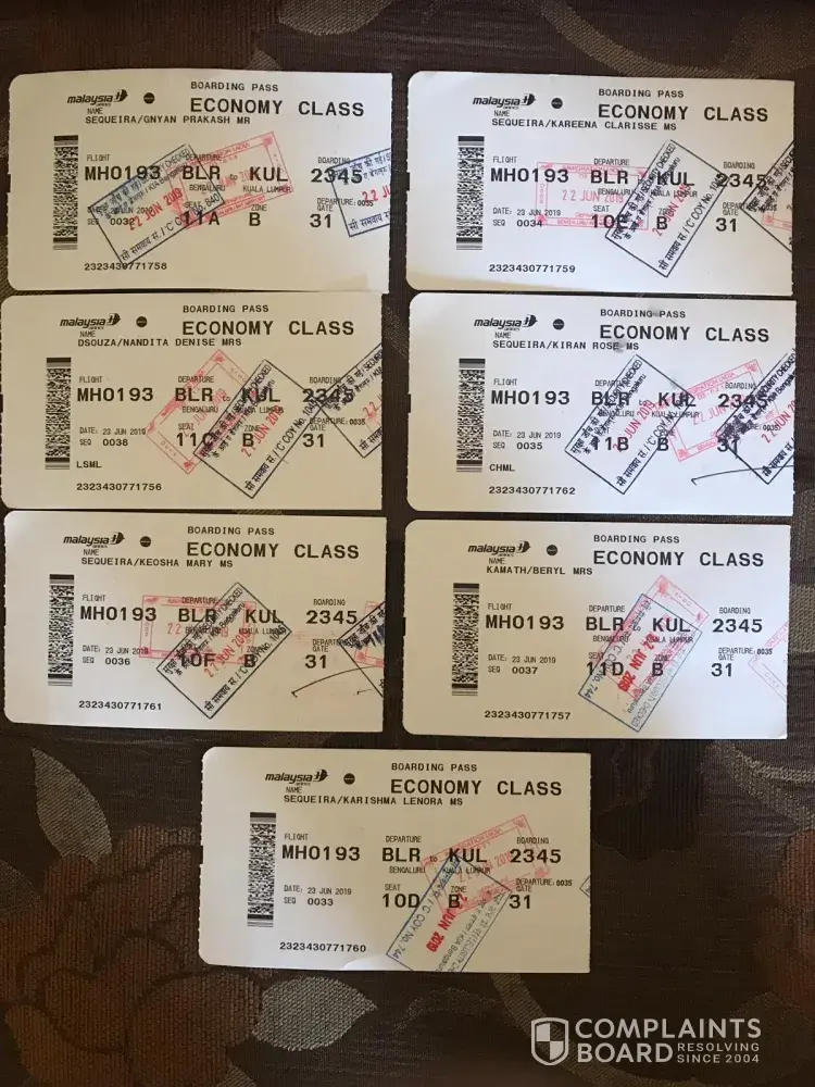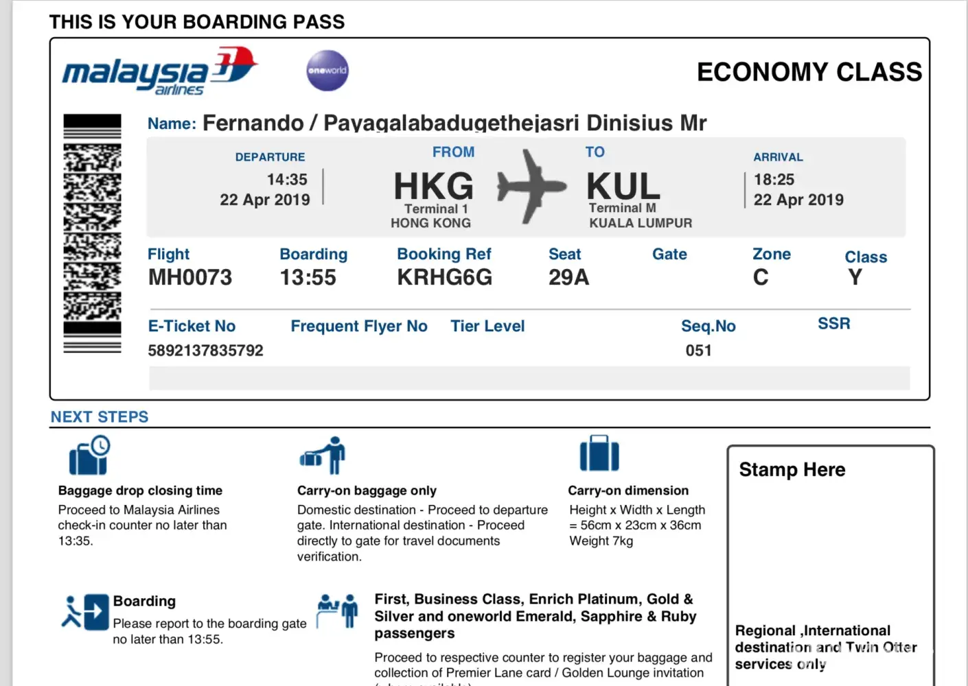 I made an online booking through Jet Airways for my travel journey to Hong Kong from Colombo with my wife and father on 12th April 2019 and return back on 22nd April 2019. However since Jet Airways flights was cancelled I was redirected to Malaysian Airlines. Thereafter on 12th we went to Hong Kong Via Kuala Lumpur on flight MH0178 and MH0072. Since my return flight back to Colombo was due on 22nd April 2019 I made an online check in on 20th April 2019 and received our boarding passes through email.