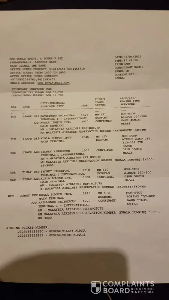 We landed in Sydney on Flight MH123 with Reference: NG5U7P on the 17th of april at 10:00AM AEST. We will be leaving for Kathmandu on the 21st of May on MH140 Ref: NG5U7P at 22:10 AEST.