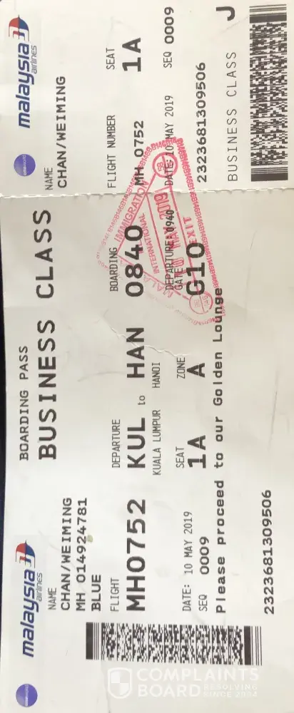 Please find attached a copy of my boarding pass, ex KLIA to Hanoi on a business class.