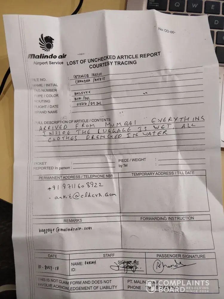 When I received my luggage I saw that the sticker attached at the time of check-in at Mumbai Airport was not present and the zipper of the bag was slighlty open. Upon opening I found that the whole bag was filled with water and all the contents of it were drenched with water. I even showed it to the Malindo executive present near the baggage belt, who asked me to fill a complaint form (attaching an image of the same.
