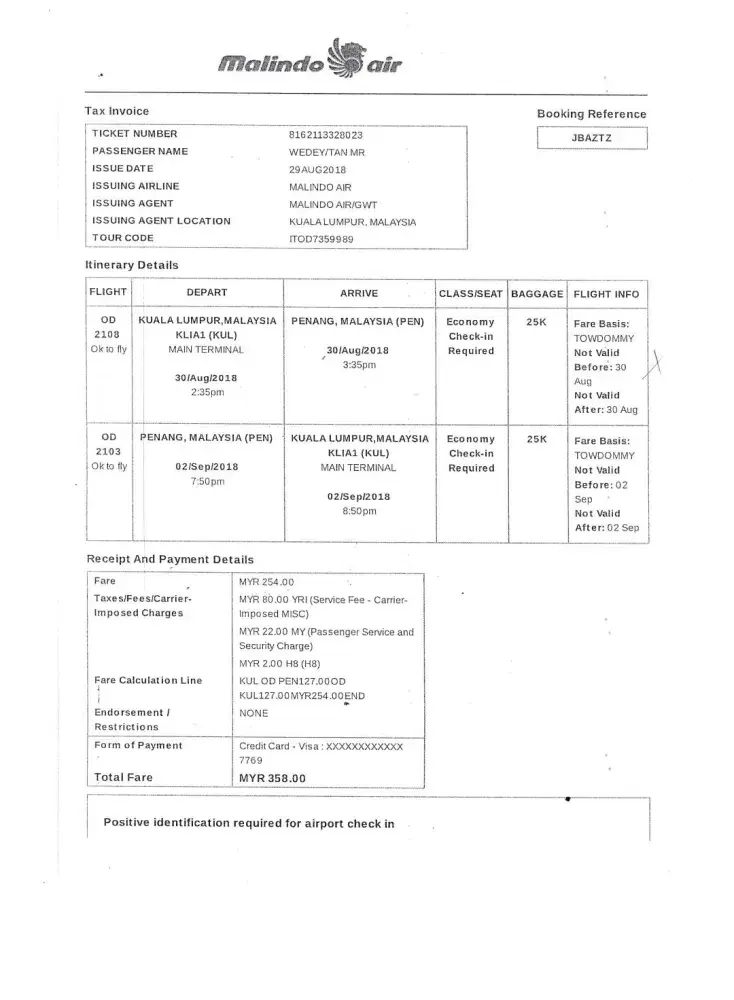 I am retired major of Bangladesh Army and presently working in a renowned Real Estate Company as GM & Head of Corporate HR. I along with my wife and son (17 years old) traveled to Malaysia and Singapore from 27 July 2018 to 05 Aug 2018. We planned to go to Langawi directly from Dhaka and then from Lagkawi to KL by Malindo Airlines. Thereafter, from KL to Singapore by Road by Aeroline Bus and back to Dhaka from Singapore on 4 September 2018 by Regent Airways. As per our travel plan we had tickets of Malindo Airlines to go to Langkawi and KL. Our Malindo Airlines Ticket Booking references are 'RR4D8F', Issue Date: 15 July 2018. Our flight No was OD 161 to go to Langkawai from Dhaka on 27 July at 01:10 am. We have nicely completed our tour and enjoyed the hospitality and journey on board in Malindo Airlines. Thanks for your nice hospitality.
