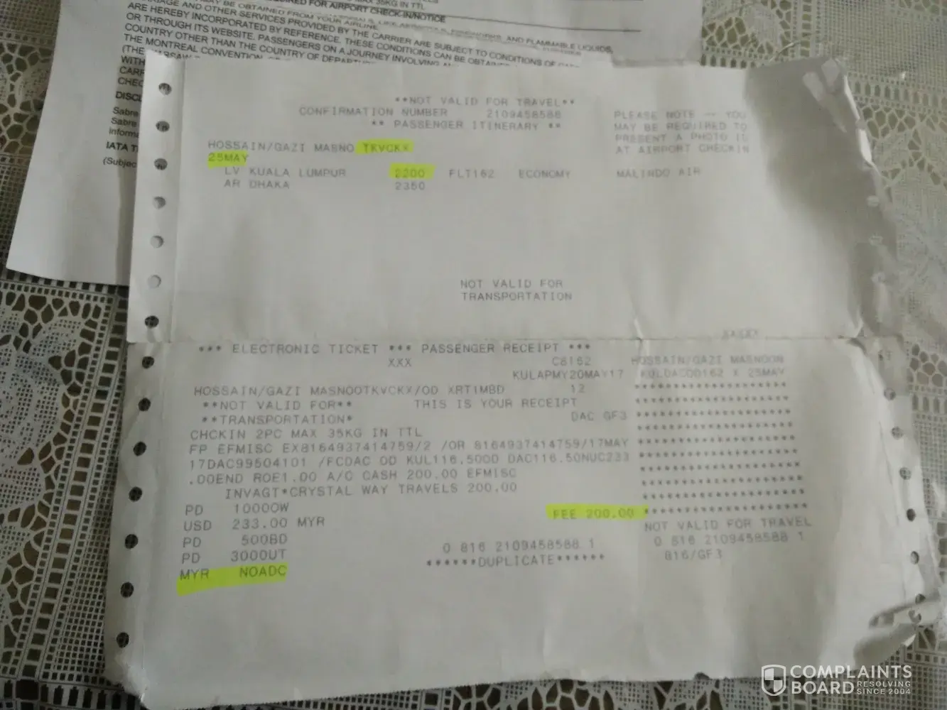 Immediately I instructed the travel agent to re-issue the tickets and charge me additional cost to be incurred. I called my travel agent again at 11.20 pm to check the status, she told that it was almost done and my one(Naushad Bin Islam) was re- issued by then and I can proceed to collect boarding pass, while another will be done in 2-3 minutes(within the issuing time of my boarding pass), at around 11.25 pm I approached to the check in counter to collect my boarding pass(I noticed Mr Tofayel was closing the counter, I informed him my ticket has been re-issued and boarding pass can be given to me meanwhile Ms. Sumona Akter’s will be issued also). As he was hurry leaving the counter, he rudely uttered that he will look into the computer once only and if he didn’t see our tickets were issued, he will just leave and shockingly stated to me “if I don’t find, don’t you dare to request me againâ€(I was shocked with his behavior but kept myself calm as I was at need), he looked into the computer and saw my ticket was issued, I requested him to issue my boarding pass and meanwhile other will be issued also, he cautioned me saying he can only issue my boarding pass and can’t wait for my fiancée. I again requested him that he wouldn’t have to wait, it might have already been issued. At this point, Mr. Tofayel suddenly closed his computer and left the seat uttering local slangs in a fading voice. We kept on requesting him saying that please check that the tickets were issued(Time was around 11.35 pm, at this point of time I called the travel agent, she ensured me that both the tickets were re-issued by then). As he was rushing to the lifts, my fiancé went close to him and requested him again to issue our boarding pass, but he, with a big surprise to us, uttered to my fiancée saying “you nonsense lady, my flight will be delayed for your ignorant actâ€. I was so surprised that I sat on the floor listening to this degree of unprofessional behavior from a hospitality industry staff like him. I am a frequent traveler and in my life I have travelled many countries in several airliner, I am very much familiar with the last limit of boarding time as well as the Airline staff’s hospitable behavior and attitude also. But, I never met/had to face such an unprofessional staff in my lifetime. I strongly believe that he didn’t do it for his flight will be delayed, but he did it to show off his power and to upkeep his ego. My travel agency later informed me that Malindo Air charged additional BDT 32000(US$400) for 2 of us for re-issuing the ticket on 25.07.17. And, we had to get the tickets again re-issued on 26.11.17 which was again charged additional BDT 8000(US$100), plus the 1 night hotel charge US$ 80(Total amount US$ 580 was our loss due to Mr. Tofayel’s intentional negligence).