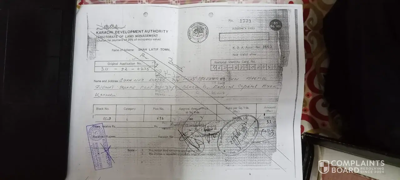 After completion of my all the installments in December 2019 Mr Rana Muzzamil asked me to submit the pay order in favor of MDA for Rs 150, 000 (PO# 4584155 Rs. 90, 000 + PO# 4584156 Rs. 60, 000) which was expired after 6 months and my transferred process not done. Which was I refunded from the bank after cancellation stamp imposed by the MDA officer. When I enquired about the project with MDA counter staff they informed me we not aware about the society and it is not listed in MDA record. I kept follow up with Mr Rana Muzzamil after allotees pressure Mr. Rana Muzzamil arranged meeting in MDA (Shahrah-e-Faisal branch) with Mr Ateeq (Cell# [protected]) Mr Ateeq tried to assured us that society is legal but due to some payments not yet submitted by the builder that's why MDA is not allowing builder start work in the society. Mr Ateeq have showed us the society details in one of counter computer in excel file in the name of Mehran society.
