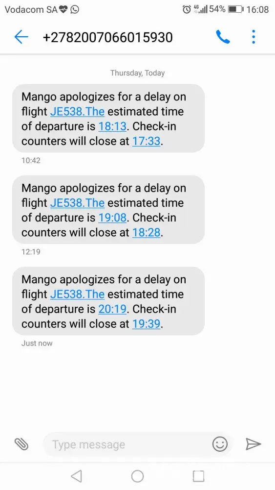 My return flight to Johannesburg JE288 on the 5th was also delayed with an hour and 27 minutes. Causing even more stress. After arriving late in Johannesburg, I still had to travel to Pretoria, and start work the next morning at 06h00.