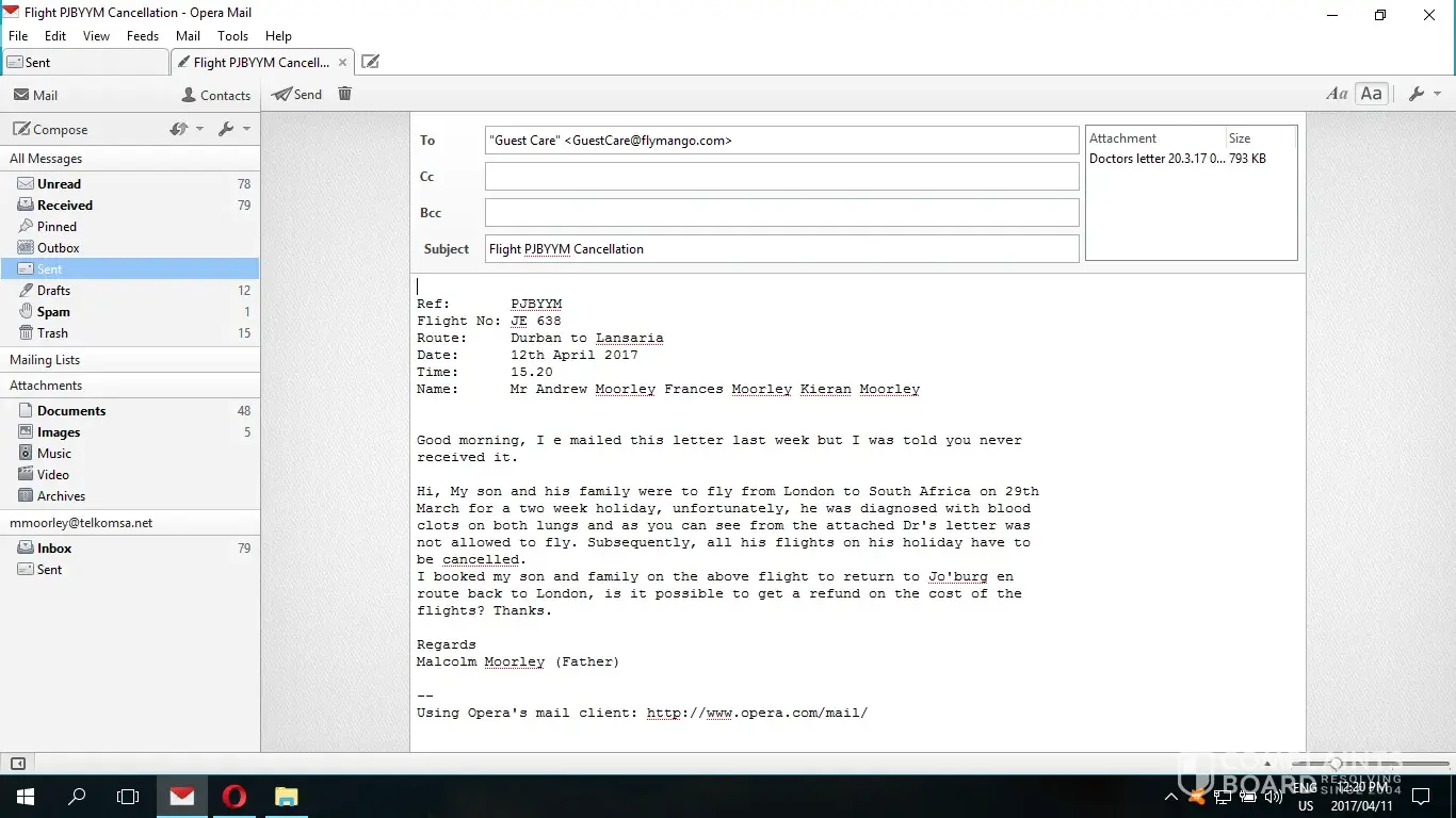 I am appalled at the lack of communication from Mango. I sent the e mail below with the doctors certificate to cancel the flights due to my son's medical condition. After trying to contact Mango, I eventually spoke to a lady who told me a voucher would be e mailed to me on Thursday 6th April 2017. I waited until today, 11th April but did not receive a voucher. I tried to phone Mango Refunds and after waiting 20 minutes a lady answered. I told her of my concern and she promptly but me back on hold. I held for another 25 minutes and then gave up. Why can't they answer the e mails it is so much easier than trying to phone.