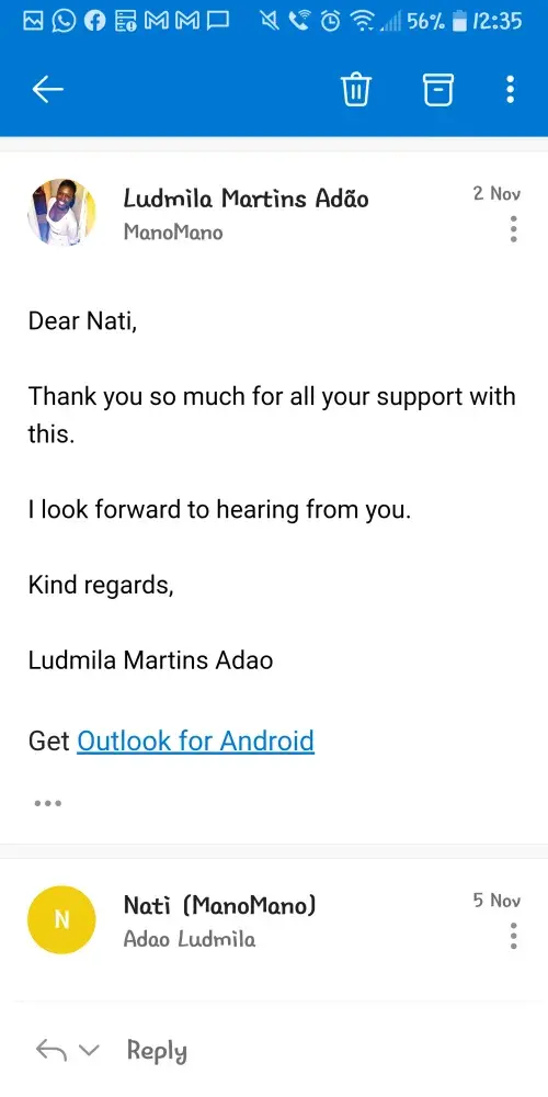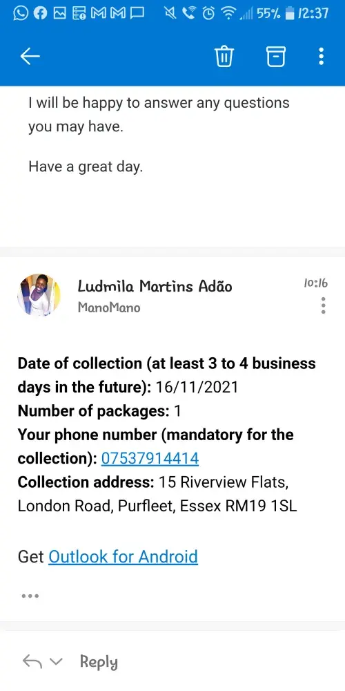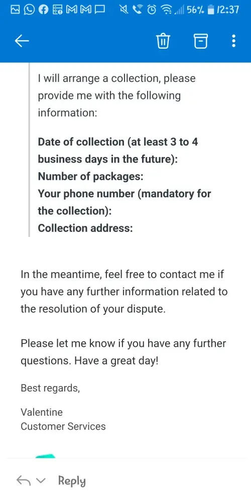 I explained to both ManoMano and Deuba, that every time that a new collection is arranged (more than 5x), I take a day off from work, so I stay the whole day at home. I have lost 5 days from work, as neither Deuba nor ManoMano notified me that they will not show up it has created a lot of distress and hindered my mental health.