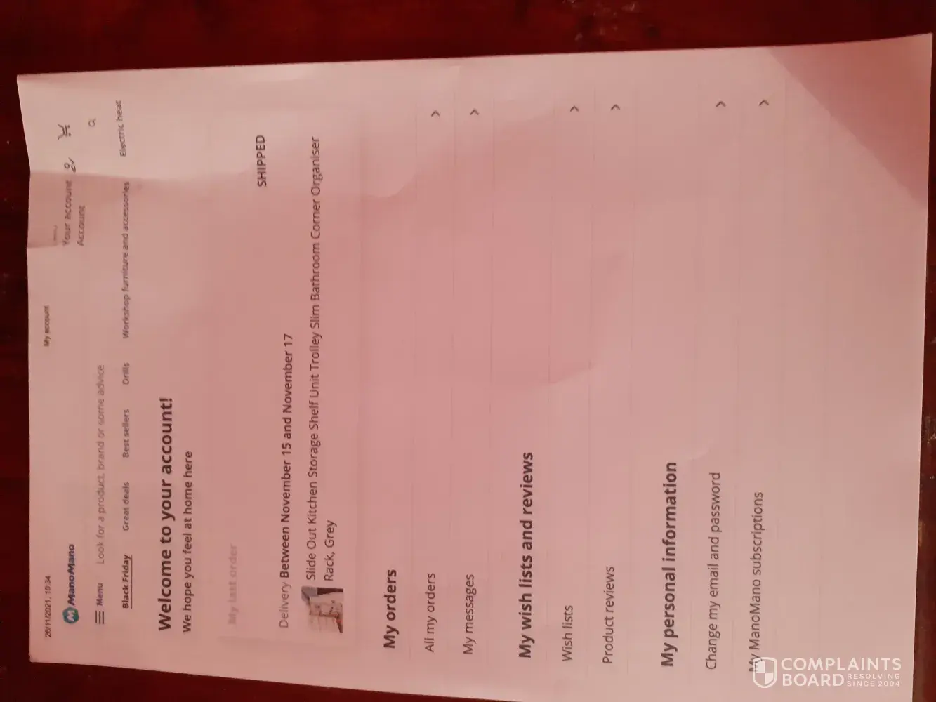 I called Mano Mano on 21st June to ask where my order was and they repeatedly told me it would arrive the next day I then noticed they had the wrong postcode.