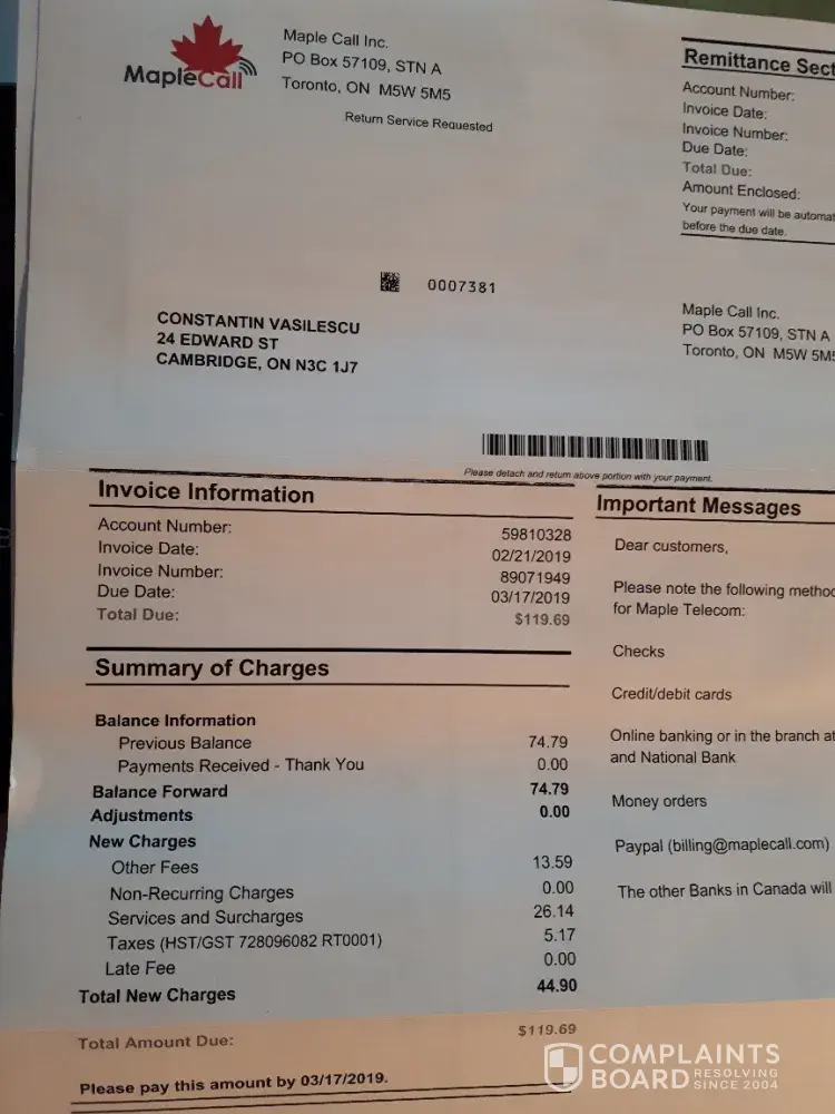 I received a voice message on May 31, 2019, from a customer representative named Remus on behalf of Maple Call about a balance of an invoice. I called back on June 3rd and spoke to another customer representative explaining that we do not know any Maple call company and we never had an agreement with them. They said that Blutone company we had our international calls before went out of business and they took over. I told him that we found out about it because suddenly we had to pay through Fido, our local provider, a lot of money for the international calls. The guy went on and on saying that we have 123$ balance to pay.
