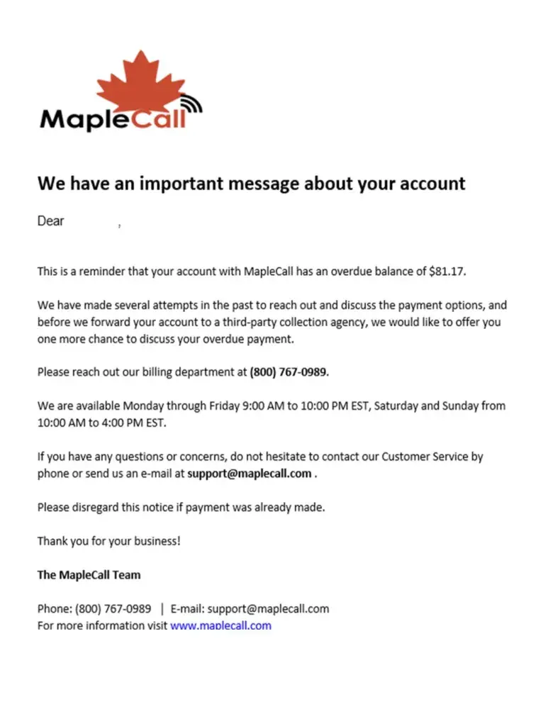 I have received many invoices from Maple Call - a company I have never heard of and would have never authorized as my long distance provider. I am with Bell Canada. Somehow they received my personal information, and have been trying to extort $81.17 from me for long distance calls. I returned each invoice with a note explaining that I am not a customer and have not used their services. I also sent them many emails, and reported them to the Better Business Bureau. Lately I have been receiving phone calls and emails telling me that if I do not pay, they will forward my account to a third-party collection agency. I do not believe that Maple Call is a valid company - the address they provide is a residential address in Windsor Ontario. They do not answer their phones or will leave you on hold for hours. When I finally do get thru, I am only able to speak to a customer support representative who would not provide proof that I had authorized Maple Call to be my long distance provider. When I ask for a breakdown of the $81.17 charges, they could not provide a breakdown, but they do offer to lower the bill as long as I would give my credit card information for payment over the phone. I'm not sure what to do with their threats of forwarding my account to a third-party agency and I am concerned about my credit score. However, if Maple Call is not a valid company, I doubt they can send my account to "Collections".