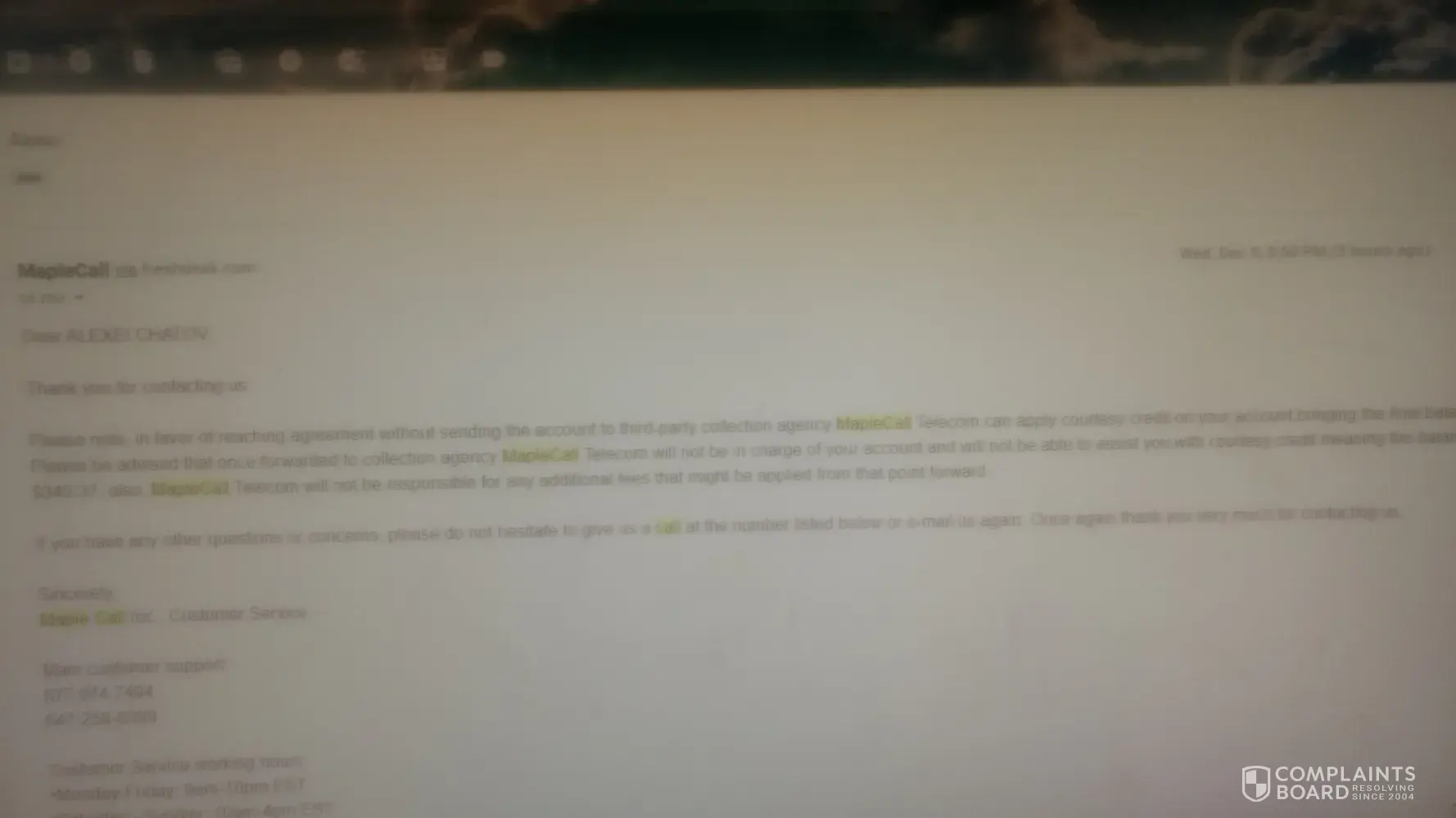 Then I start receiving invoices from Maple Call with Account #[protected], which I have never heard of or signed any contract/agreement with, requesting to pay them the balance I owed to NECC Telecom. I called several times and advised that I am willing to pay the balance as long as Maple Call provide me with an official notification of legal connection between the two companies or proof that Maple Call can legally collect the balance I owed to a company that was no longer operating. I was told that they cannot provide such a document but they can send me an email that I have to pay them which would not proof anything. One of the Maple Call representatives, I spoke with on June 12, 2019, George, told me that they have just got the customer contact list from NECC but there was no acquisition or merger. Spoke with a supervisor and 3-4 more customer service representative but they were not helpful at tall either. I was repeating my requests but no one was able to answer my questions or provide any proof they have a legal right to collect. I kept receiving bills every month till June 2019 (moved to another address) where the with the accumulated interest amounted to a total of $99.19. At this point, after so many attempts to resolve the issue, I stopped answering the calls as that turned to be a very disturbing and upsetting situation.
