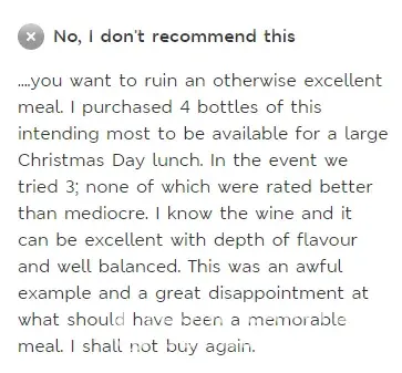 My partner brought a £25 bottle of Chateau Neuf du Pape as a treat(far more than we would normally pay for a bottle of wine). On pouring the wine looked thin and on tasting the wine was very acidic and vinegar like. We have had £4.99 bottles from Aldi that taste much better!...This is especially disappointing as we value marks and spencers as a quality shop and have had wine around the £10 mark from there which has been very good. Please see attached picture of wine plus some of the other disappointing reviews on this product. We had no other wine to entertain with so were forced to drink this so can not return