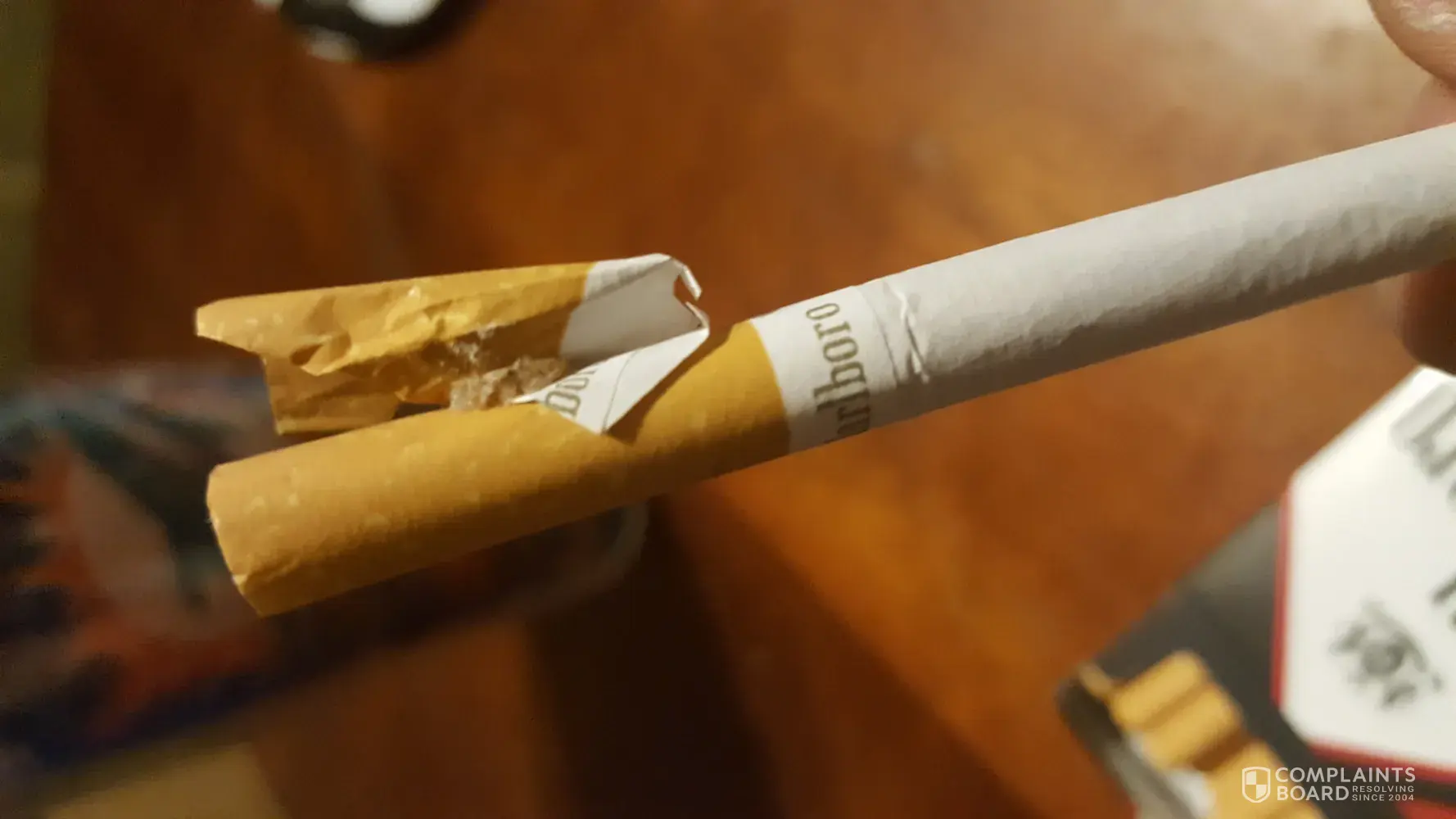Wondered why it felt like I want getting anything when I was smoking. Looked at my cigarette and it has a tear at the bottom. I just opened this pack of cigarettes. Not happy. Very unprofessional. I have a picture of it. Box # xbgt 04759 I won't ever but marlboros again! Cigarettes aren't supposed to come broken and this was a brand new pack. Very disappointed. I will just but winston's from now on.