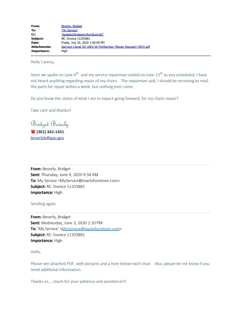 My two chairs was purchased in 9/19 and I received them 10/19. They came with a 1 year warranty. By 11/19, my chairs didn't work. I've been trying to get resolve since and finally, I was directed to go Marlo for a service request, which I did. Finally, a service tech came out on 6/13/20, determined it was delivery damage. Nothing since!